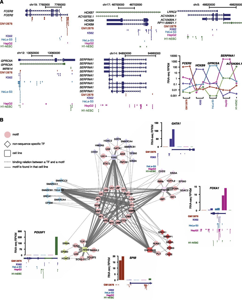 Cell-type–specific binding of sequence-specific and non-sequence-specific TFs. (A) Abundant TF binding sites are observed near cell-line–specific transcripts. Binding sites are shown as vertical bars and colored by cell line (dark blue for K562, red for HepG2, brown for GM12878, green for H1-hESC, and cyan for HeLa-S3). (Bottom, right) Expression levels (in RPKM) for example cell-line–specific transcripts across the five cell lines with the most ChIP-seq data. (B) Secondary motifs identified in the ChIP-seq data sets of sequence-specific TFs and their enrichment in the ChIP-seq peaks of non-sequence-specific TFs. The five cell lines are indicated with color-coded squares, noncanonical motifs of sequence-specific TFs are shown in pink circles and a solid line connecting each motif to the respective cell line. The thickness of the solid line is proportional to the normalized frequency in which a noncanonical motif is discovered in a particular cell line. Non-sequence-specific TFs are shown in diamonds whose colors match the color of the cell line if there is a ChIP-seq data set of the TF in that cell line. Dashed lines connect non-sequence-specific TFs and noncanonical motifs, indicating that a noncanonical motif of a sequence-specific TF is enriched in the ChIP-seq peaks of the non-sequence-specific TF. (Four insets) Expression profiles of sequence-specific TFs whose canonical motifs are found to be specific to a cell type and the TF binding sites around the genes that encode these TFs in the appropriate cell line. The expression levels in each cell line are assigned a similar color as the cell line. For four cell lines, two biological replicates were available for RNA-seq data; hence, there are two bars for each of these cell lines. Only one biological replicate was available for H1-hESC.