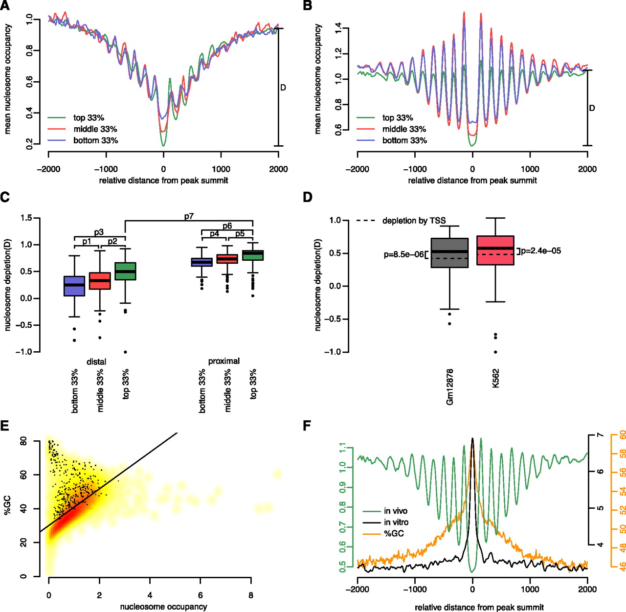 Chromatin structure and GC content around TF binding regions. (A,B) Nucleosome occupancy profiles anchored on the summits of TSS-proximal (A) and TSS-distal (B) peaks of YY1 grouped by ChIP-seq signal strength: top (green), middle (red), and bottom (blue) third peaks in terms of ChIP-seq signal. Nucleosome depletion for the top third peaks is shown as D in each panel. (C) Distribution of nucleosome depletion “D” across all tested TFs, with peaks stratified according to TSS proximity (proximal or distal) and ChIP-seq signal strength (top, middle, or bottom third). P-values for pairwise comparisons based on paired Wilcoxon rank-sum tests are: P1 = 8.2 × 10−17, P2 = 7.6 × 10−21, P3 = 3.8 × 10−23, P4 = 8.8 × 10−10, P5 = 1.1 × 10−9, P6 = 1.1 × 10−11, and P7 = 6.6 × 10−22. (D) TF binding is correlated with significantly more nucleosome depletion than TSS. Wilcoxon rank-sum test P-values are shown separately for GM12878 and K562 cells. For the box plots in C and D, only those subcategories with 200 or more peaks are included, and whiskers represent the 1.5 inter-quartile range. (E) Nucleosome occupancy genome-wide is correlated with GC%. The smoothed density scatter plot contains 40,000 data points; each data point is a randomly chosen 250-bp region of the human genome. (Black dots) Those regions that overlap with ChIP-seq peaks. (Black line) Least square fit. Pearson correlation coefficient = 0.62; P-value < 2.2 × 10−16. (F) Comparison of in vivo (green) and in vitro (black) nucleosome occupancy profiles around peak summits of YY1. GC% profile around the same summits is plotted in orange. Note elevated GC% at summit coincides with high in vitro nucleosome occupancy and low in vivo nucleosome occupancy.