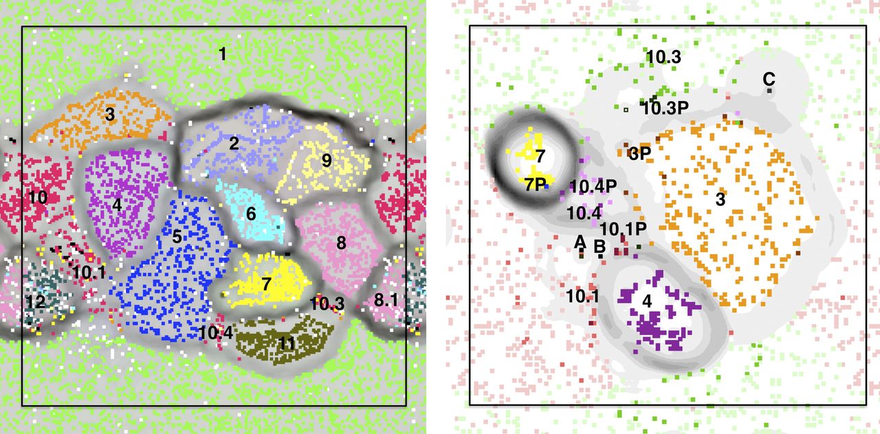 Time series-based ESOM binning of the whole data set (left) and Staphylococcus scaffolds (right). (Left) An ESOM in which each point represents a 500- to 6000-bp segment. Data points are colored based on their scaffold's best hit from all published genomes in the NCBI nucleotide database (white data points have no significant hit). Note that the map is periodic. Clusters are: 1. Candida albicans; 2. Finegoldia magna; 3. Staphylococcus hominis; 4. Staphylococcus lugdunensis; 5. Leuconostoc citreum; 6. Peptoniphilus Carrol (novel species); 7. Staphylococcus aureus; 8. Propionibacterium Carrol (novel species); 8.1 Propionibacterium acnes; 9. Streptococcus; 10. Staphylococcus epidermidis, regions on the genome that are common to all strains; 10.1 strain 1 and some low abundance scaffolds that probably belong to rare S. epidermidis strains; 10.3. regions unique to S. epidermidis strain 3; 10.4. regions unique to S. epidermidis strain 4; 11. Enterococcus faecalis; and 12. Anaerococcus. (Right) An ESOM of the Staphylococcus genomes (numbers are the same as in the left panel), their plasmids (extension “P”) and infecting phage (A: phage 13; B: phage 14; and C: phage 46). For S. epidermidis strain 1, dark red represents segments unique to the strain, while light red represents regions common to both strain 1 and strain 3 (likewise dark/light green for strain 3).