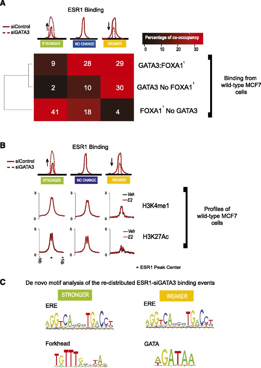 GATA3-dependent ESR1-binding events show distinct transcription factor co-occupancy and histone modifications. (A) A binary co-occupancy analysis showing the percentage of the ESR1 categories affected by depletion of GATA3 normally co-occupied by GATA3 and/or FOXA1. GATA3 and FOXA1 binding is from wild-type MCF7 cells. (Data from Hurtado et al. 2011.) (B) Averaged signal intensity of H3K4me1 and H3K27Ac active histone marks in unstimulated (Veh) and estrogen (E2)-treated cells centered on the different categories of ESR1 binding influenced by silencing of GATA3. (C) De novo motif analysis (Weeder).