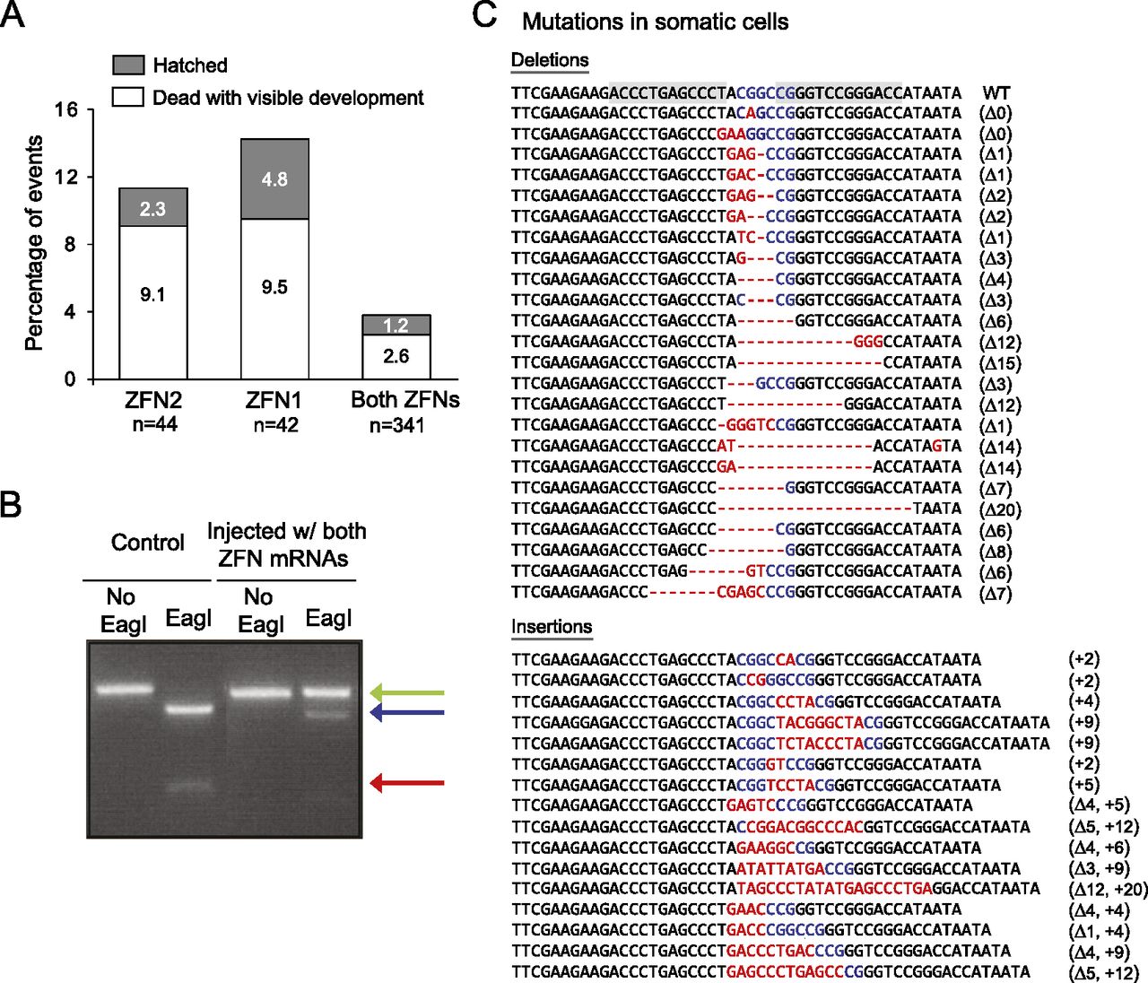 ZFN-induced mutagenesis at the cry2 locus in somatic cells. (A) Effects of ZFN mRNA injections on monarch embryos. The bar graph depicts the rate of hatching larvae (gray bars) and of embryos presenting development but dying before hatching (white bars), associated with egg injection of each of the ZFNs mRNA alone (linked to either of the obligate heterodimeric versions of the FokI nuclease domain) or both ZFNs mRNA at 0.5 μg/μL. For comparison, control embryos injected with water in similar conditions hatch at a rate of 19.5% with an additional 3.6% that develop but die before hatching (n = 82). Uninjected embryos hatch at a rate of ∼75%. (B) Agarose gel example of lesions observed in somatic cells of hatched larvae and dead embryos injected with both ZFN mRNAs, showing a high degree of targeting (green arrow), compared with an uninjected control. (C) Mutations observed in somatic cells of dead embryos, and dead or live larvae, from eggs injected at different doses of ZFN mRNAs.