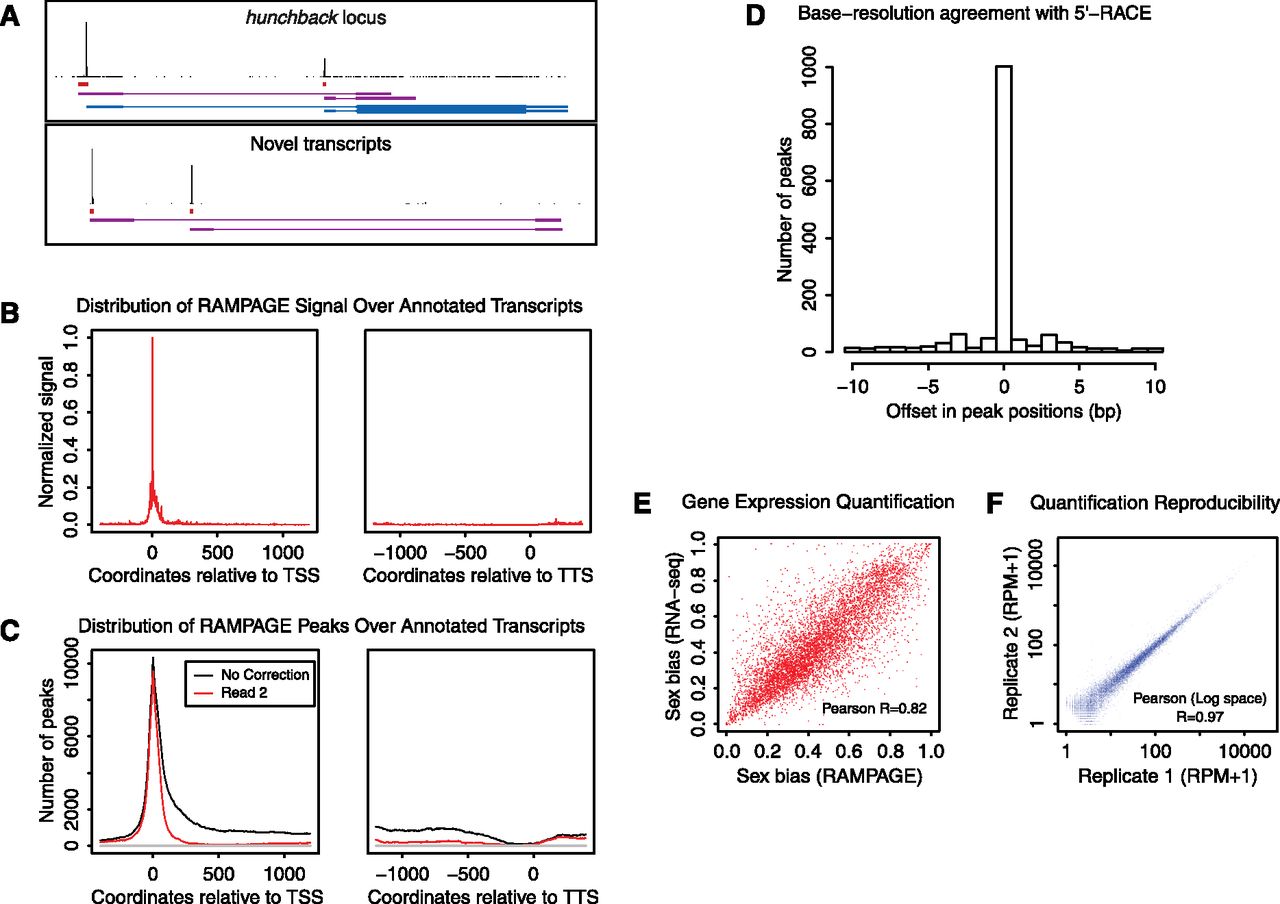 RAMPAGE: specific, accurate, quantitative paired-end sequencing of 5′complete cDNAs. (A) Graphical representation of the data at the hunchback gene locus and at an unannotated locus harboring novel transcripts. For each panel, the top track shows the density of cDNA 5′ ends per position on the upper strand, which can be interpreted as a single base-resolution profile of transcription initiation activity. The second track represents the peaks (i.e., TSS clusters) called from that density profile. The third track shows the partial transcript models reconstructed ab initio from our sequencing data using Cufflinks. For the upper panel, the fourth track displays FlyBase transcript annotations. For the bottom panel, note that paired-end information allows one to infer a functional link between the two promoters, which appear to be alternative promoters for a common locus. (B) Metaprofile of signal density over all FlyBase r5.32 transcript annotations. (TSS) Transcription start site; (TTS) transcription termination site. (C) Metaprofile of peak density over annotated transcripts. (Red curve, downstream read coverage correction; black curve, no correction; all other peak-calling parameters were kept identical). (D) Histogram of the cross-correlation of TSS cluster positioning by RLM-RACE and by our method. For each cluster, we determined the positional offset (in base pairs) that maximizes the cross-correlation between the data from the two methods. (E) Comparison of RAMPAGE and standard RNA-seq performance for relative quantification of gene expression. We compared the measures of sex bias in the expression of genes obtained by the two methods. (F) Reproducibility of expression level measurements between biological replicates. ([RPM] Reads per million.)