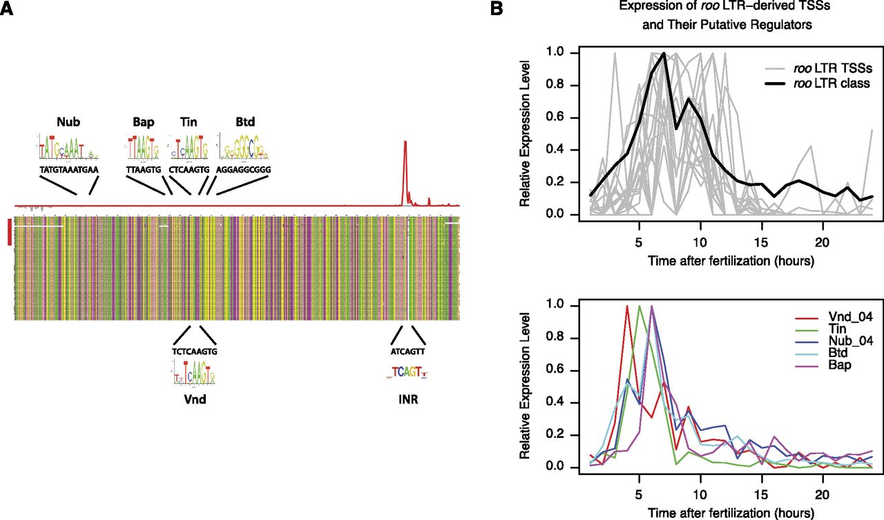 Core promoters and cis-regulatory elements in transposable elements: roo LTRs. (A) Multiple alignment of the sequences of the 18 LTRs providing TSCs for host genes (red bar on the left) to the roo consensus (upper sequence) and to a set of full-length LTRs with high similarity to the class consensus. The histogram above shows the density of tags on the upper (red) and lower (gray) strands. The positions of various sequence motifs are depicted, along with the logo of the known motif and the actual consensus sequence of the LTR. The TFBSs for NUB and BAP and the Initiator sequence (INR) are on the upper strand; the TFBSs for TIN, VND, and BTD are on the lower strand. (B) Expression profiles of the genes encoding putative regulators of roo LTRs. nub and vnd have more than one TSS, and only the one with the expression profile most consistent with roo LTRs is shown.