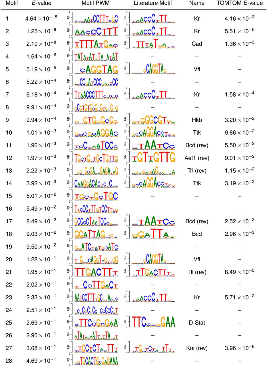 Motifs discovered in cis-regulatory modules for fly segmentation. The table lists all motifs that XXmotif reports up to an E-value of 0.5 on 54 segmentation modules responsible for patterning the anterior-posterior (AP) axis during early embryogenesis. To score conservation, multiple sequence alignments of D. melanogaster, 11 other Drosophila species, and Anopheles gambiae were supplied as input. For 18 of the 28 predicted motifs, similar literature motifs of transcription factors known to be involved in AP axis segmentation were assigned by TOMTOM (Gupta et al. 2007) or by visual inspection. Nine of the predicted motifs may describe transcription factors representing missing nodes in the transcriptional network.