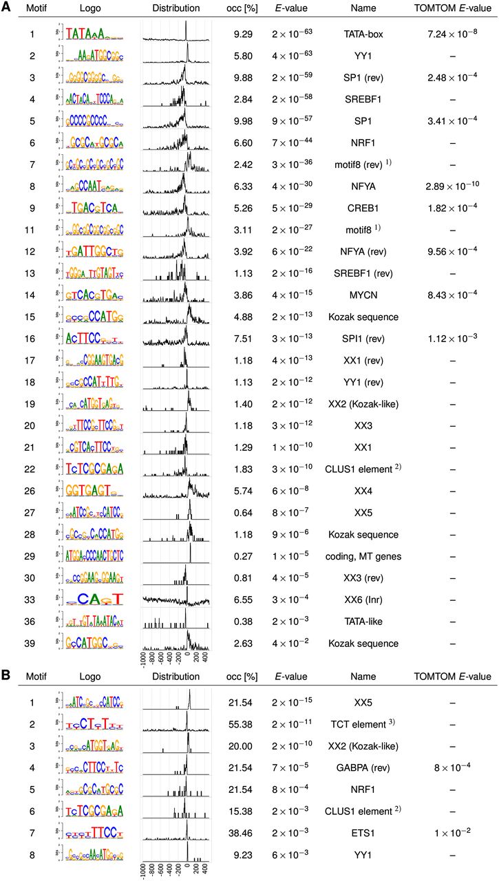 Human core promoter motifs discovered by XXmotif. (A) List of motifs up to an E-value of 0.1 in a set of 1871 human core promoter regions (−300 bp to +100 bp around TSS) from the eukaryotic promoter database (EPD) (Schmid et al. 2006). For 20 of the 39 predicted motifs, similar literature motifs were assigned by TOMTOM (Gupta et al. 2007) or us (last two columns). The motif at position 18, which was originally named Initiator (Xi et al. 2007), is actually the reverse complement of YY1. Eight novel, highly significant motifs, designated XX1 to XX6, XX1(rev), and XX3(rev), show positional distribution peaks near the TSS. XX6 is the canonical Initiator motif similar to elements found in D. melanogaster and S. cerevisiae. Ten motifs with a broad positional distribution are not shown. The positional distributions of the PWMs were obtained by scanning the PWMs over a larger region (−1000 bp to +500 bp) around the TSS. (B) Top eight motifs obtained with the core promoter sequences of the 65 genes annotated as coding for ribosomal proteins in EPD (Xi et al. 2007; FitzGerald et al. 2006; Parry et al. 2010).