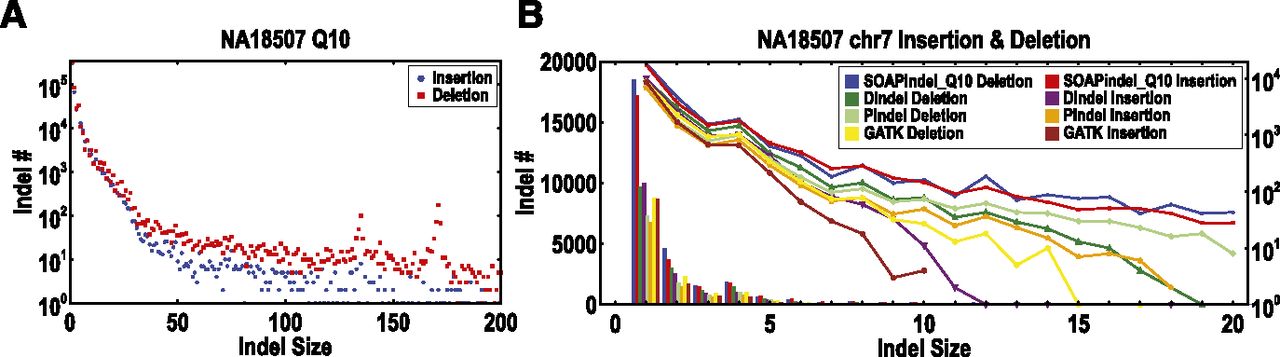 SOAPindel predictions (Q10) on NA18507. (A) Distribution of insertion and deletion. (B) Comparison of the detected insertion and deletion between SOAPindel, Dindel, Pindel, and GATK on chromosome 7. The result is shown as a histogram of the number of indels (B: left y-axis) and log ratio lines (B: right y-axis).