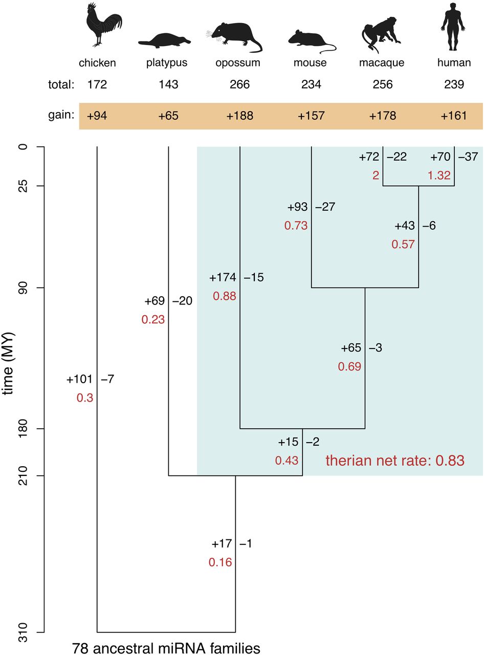 Birth and death rates of miRNA families. Phylogeny of the six studied amniote species and estimated rates of miRNA family gain and loss, as inferred by a maximum likelihood procedure (Methods), are shown. Note that the estimated number of families in the amniote ancestor that have been completely lost during evolution (i.e., with no representative in extant species) is zero. Branch lengths reflect evolutionary divergence times in million of years (MY). Number of gained (+) and lost (–) families (in black) as well as the net gain rate of miRNA families per MY (in red) are indicated next to each branch. The therian net gain rate was computed based on the gain and loss of miRNA families across the entire therian clade (light blue box). The net number of families that have been gained since the bird-mammal split are indicated in the orange box, and the total number of families for each species are indicated above.