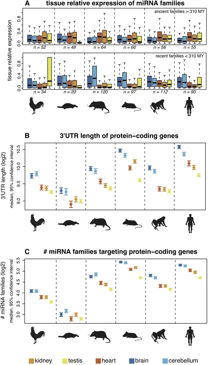 Spatial expression patterns of miRNAs and 3′-UTR structures of predicted target genes. (A) Age of miRNA families and their relative expression by tissues. Relative expression values for each family were calculated as the sum of expression values of all family members in a given tissue divided by their total expression across all tissues. Colored symbols indicate the median relative expression value of miRNA families. Ancient/recent families: families that originated before/after the mammal-bird split. Samples sizes (n) are indicated (note that miRNA families with low expression levels were filtered out in this analysis; see Methods for details). For all but the ancient macaque and recent platypus families, the difference between the maximum and minimum median values is significantly higher than expected by chance (permutation test on tissue labels, corrected P < 0.05). (B) 3′-UTR lengths of protein-coding genes. Protein-coding genes were classified according to the tissue in which they are most highly expressed. (C) Numbers of miRNA families targeting protein-coding genes (using PITA predictions). A miRNA family was considered to target a gene if one or more of the miRNAs were predicted to target the gene's 3′ UTR. Patterns are shown for all miRNA families. Notably, similar results are obtained for ancient and recent families when these are analyzed separately and using TargetScan target predictions (Supplemental Fig. S15).