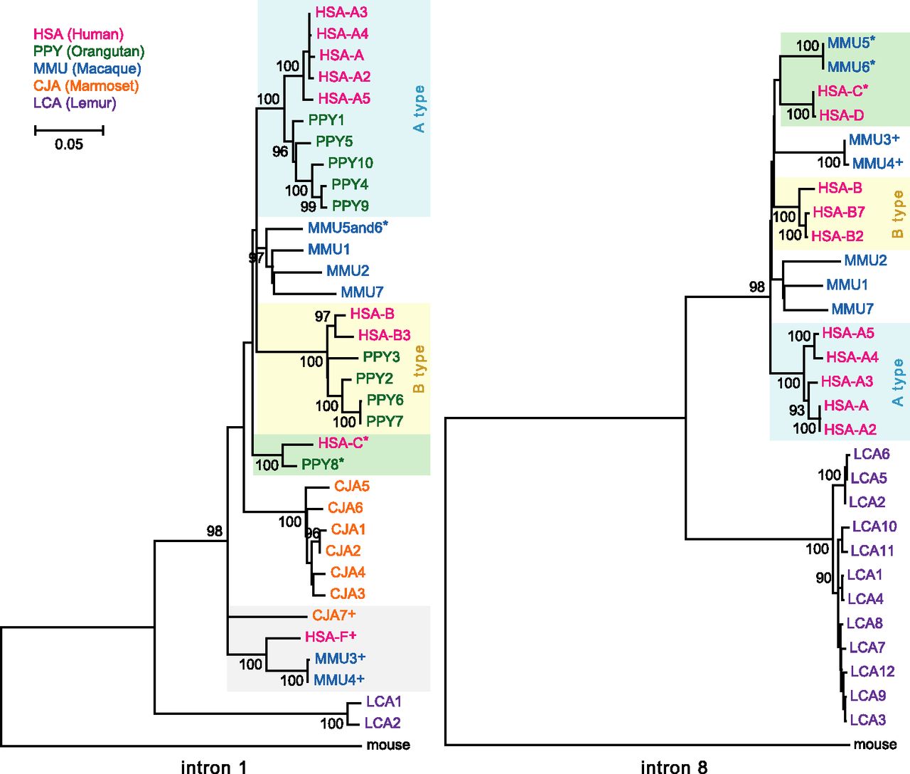LRRC37 family phylogeny. Maximum likelihood phylogenetic trees were constructed using noncoding regions from intron 1 (left) and intron 8 (right). Trees are drawn to scale, with branch lengths measured in the number of substitutions per site and bootstrap values (1000 replicates) shown. Human and orangutan A- and B-type copies are shaded blue and yellow, respectively; the monophyletic clade of HSA-F paralogs is gray shaded; branches with HSA-C, HSA-D, PPY8, MMU5, and MMU6 orthologous copies are shaded green. Copies clearly mapping to syntenic locations are signed by a superscript.