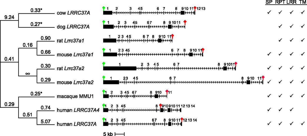 Selection of the LRRC37 ancestral locus during mammalian evolution. (Middle) The exon-intron gene structures of cow LRRC37A, dog LRRC37A, rat Lrrc37a1, mouse Lrrc37a1, rat Lrrc37a2, mouse Lrrc37a2, macaque MMU1, human LRRC37A4, and human LRRC37A are shown, with start and stop codons indicated by a green and red sign, respectively. The additional block in human LRRC37A4 exon 9 is shown in gray. (Right) Motifs identified in the translated proteins are shown: SP (signal peptide), RPT (repetitive segments), LRR (leucine-rich repeat motifs), and TM (transmembrane helix). Rat coding sequence is incomplete at 5′ and lacks the start codon. The premature stop codon in human LRRC37A4 coding sequence removes the portion encoding the transmembrane domain. (Left) Branch estimates for ω = dN/dS for exons 2–8 are shown using the free branch model in PAML. Significant branches compared to a neutral model are indicated with an asterisk.