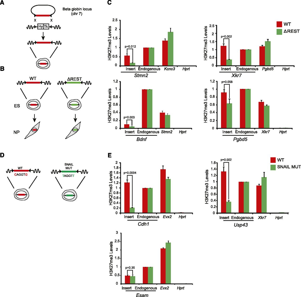 TFBS are required for H3K27me3 recruitment at the NP stage. (A) Strategy to insert promoter regions into a defined genetic site (beta globin locus) via RMCE. The two marker genes inserted into the beta globin locus confer resistance against hygromycin (Hy) and sensitivity against ganciclovir (Tk), respectively, and are flanked by two inverted lox sites (black triangles). Targeted insertion of a given transgene is achieved by Cre-mediated recombination and negative selection. (B) The RMCE approach was used to insert several REST target promoter fragments with either wild-type sequence (WT) or REST site mutation (ΔREST) into the beta globin locus. Correctly targeted ES cells were differentiated to the NP stage, where H3K27me3 and REST were measured at the inserted fragments. (C) For each of the four inserts H3K27me3 levels were measured in cells bearing the WT fragment (red bars) and in cells bearing the ΔREST fragment (green bars). Levels were measured at, from left to right in each panel, the inserted region, the corresponding endogenous locus, a positive control, and a negative control region. Note that different promoter regions are used as positive controls in the different panels. All inserted WT fragments show significant recruitment of H3K27me3 and loss in H3K27me3 for the ΔREST fragments. (D) Either wild-type (WT) or mutated (MUT) promoter regions containing predicted SNAIL sites were inserted via RMCE. The SNAIL sites were mutated by changing the first and last nucleotide of the motif to a Thymidine. Correctly targeted ES cells were differentiated to the NP stage. (E) For each of the three inserts H3K27me3 levels were measured in cells bearing the WT promoter (red bars) and in cells bearing promoters with mutated SNAIL sites (green bars). Note that the Cdh1, Usp43, and Esam promoter regions have three, two, and one predicted/mutated SNAIL site, respectively. Levels were measured at, from left to right in each panel, the inserted region, the corresponding endogenous locus, a positive control, and a negative control region. All H3K27me3 levels are scaled to that of the endogenous region and error bars show the standard error of three biological replicates. A P-value is shown and calculated for each insert using unpaired one-tailed t-test statistics.