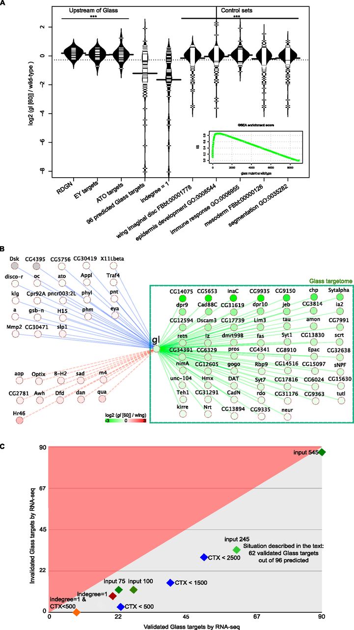 Validation of predicted Glass target genes by RNA-seq. (A) Bean plots representing the log2 (gl[60j]/wild-type) for the 96 predicted Glass target genes, compared with the same values for control gene sets. As control sets we used three sets of genes expressed upstream of glass, namely, all genes from the Retinal Determination Gene Network (RDGN) from Amore and Casares (2010); Eyeless target genes from Ostrin et al. (2006); and Atonal target genes from Aerts et al. (2010). We also used five other negative control sets, unrelated to eye development. (***) Significant difference (Wilcoxon FDR <0.05), compared with the Glass target sets. (Inset) Gene Set Enrichment Analysis (GSEA) showing a significant (FDR <0.001) enrichment of the 96 genes at the top of the ranking. (B) The predicted Glass targetome with 96 genes, showing overall down-regulation (green). (Dashed red edges) Up-regulation; (blue edges) no expression changes in the mutant. (C) Comparison of the amount of validated, or true-positive Glass target predictions (x-axis; genes that are down-regulated in the glass mutant) and invalidated, or false-positive predictions (y-axis; genes that are not down-regulated in the mutant). All situations show a higher number of true positives than false positives. (Blue diamonds) Different filters based on the cisTargetX genomic ranking; (green diamond) the situation in the text (62/96 validated targets); (orange diamond) a very stringent filtering with 100% positive predictive value, although retaining only eight Glass target genes.