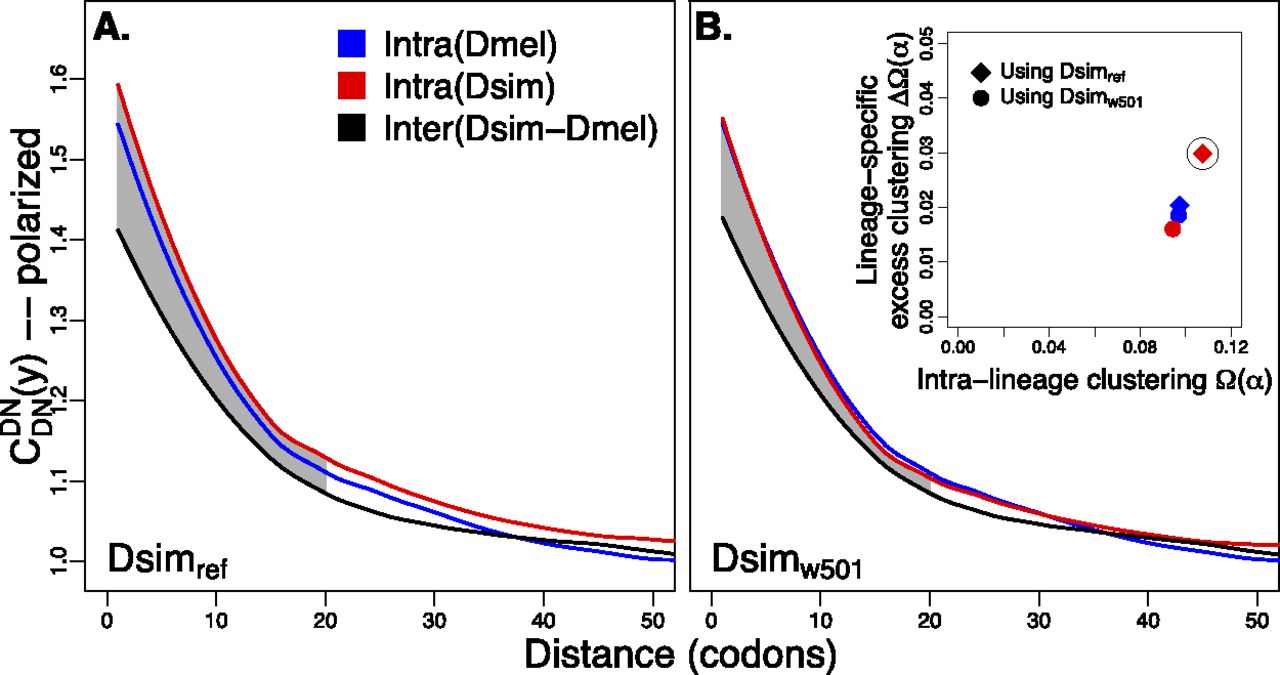 is shown in the inset (following Fig. 4B of Callahan et al. 2011). A considerably larger intralineage clustering excess is found in the D. simulans lineage when using Dsimref, which is also circled in the inset.