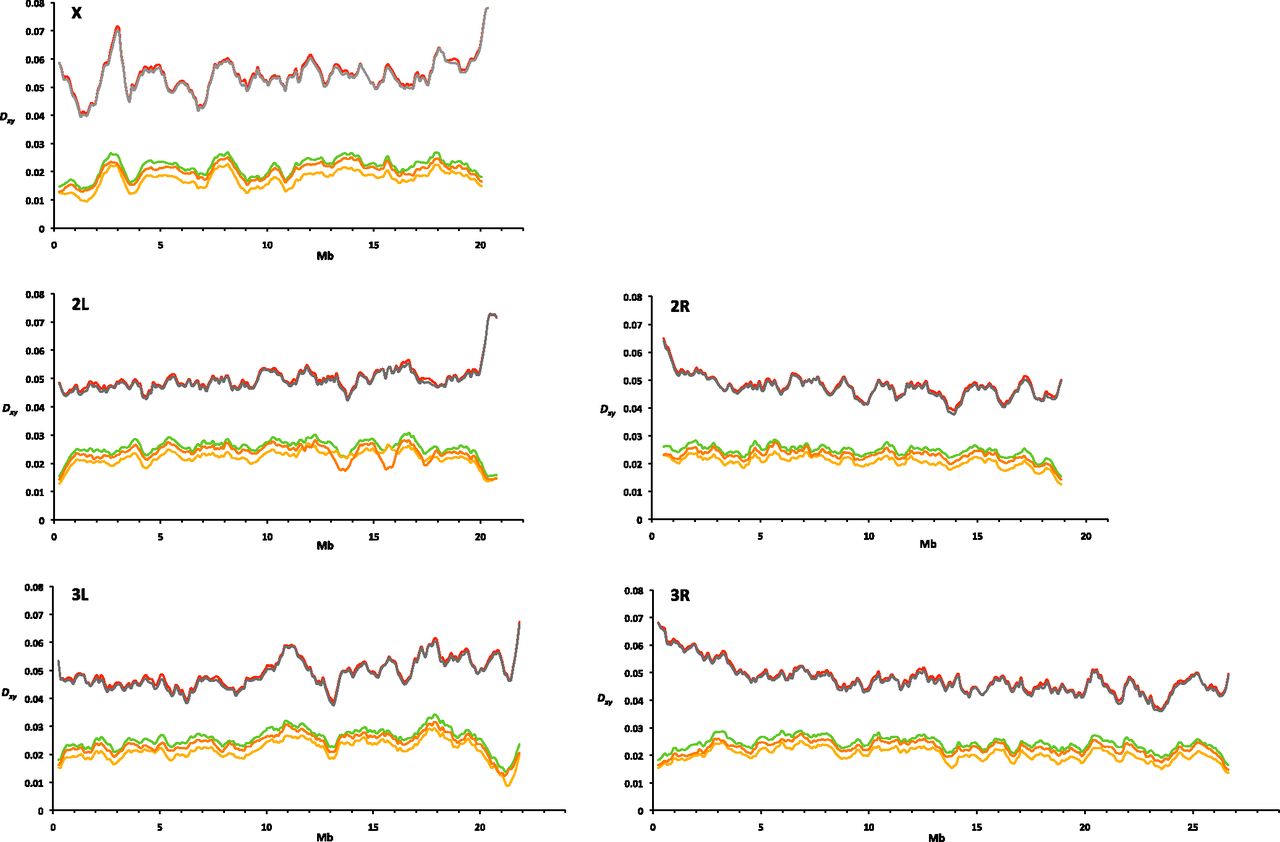 Mean pairwise divergence (Dxy) along each major chromosomal arm between species of the D. melanogaster complex. The following species pairs are shown: D. mauritiana–D. simulans (yellow), D. sechellia–D. simulans (orange), D. mauritiana–D. sechellia (green), D. simulans–D. melanogaster (gray), and D. mauritiana–D. melanogaster (red). The sliding window analysis was performed using a window size of 500 kb and a step size of 100 kb; chromosomal coordinates are those of D. mauritiana.