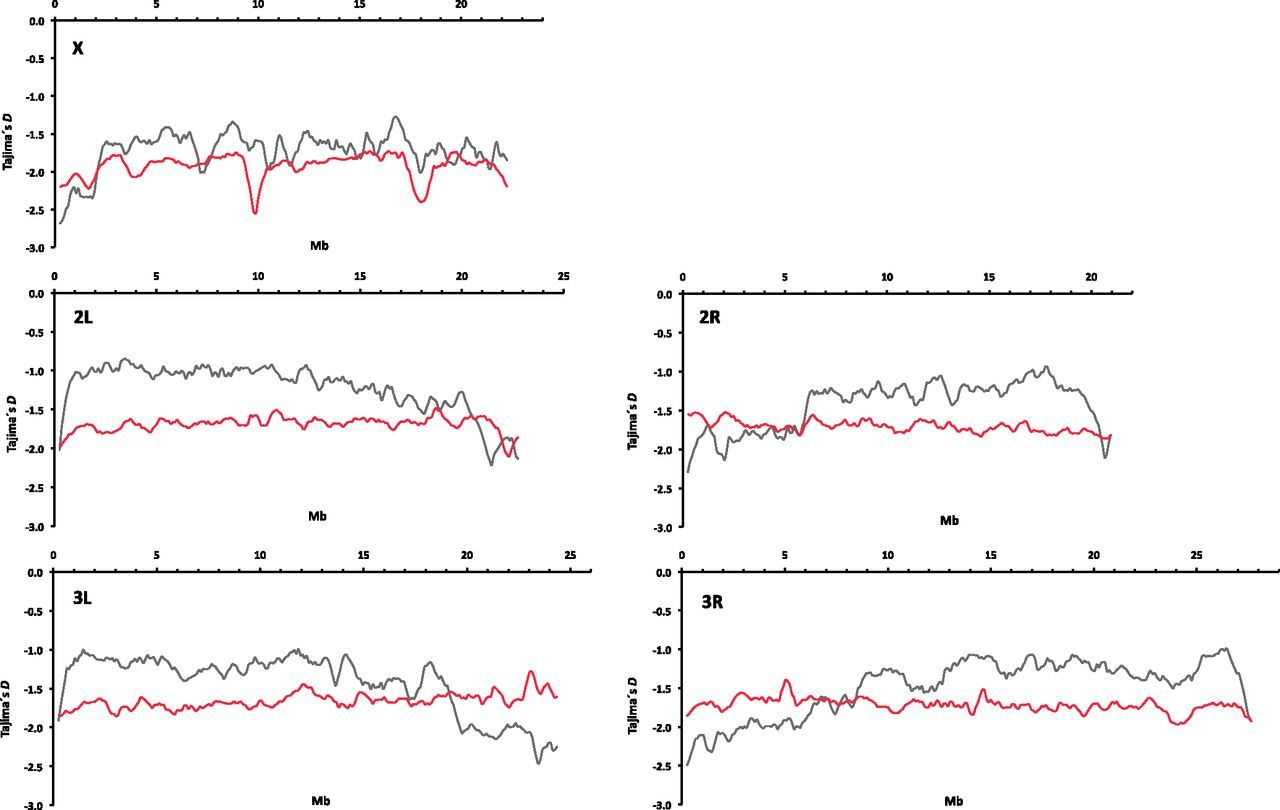Tajima's D along the major chromosomal arms in D. mauritiana (red line) and D. melanogaster (gray line). The sliding window analysis was performed using 500-kb windows with a step size of 100 kb; chromosomal coordinates have been adjusted to D. melanogaster.
