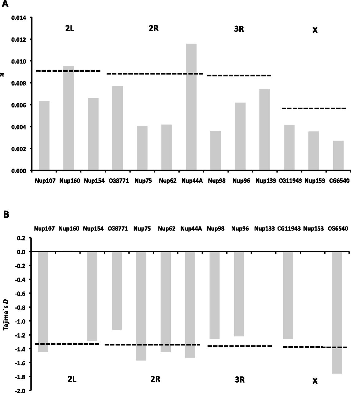 Nucleotide diversity (π) and Tajima's D at selected nucleoporin genes in D. mauritiana. (A) Nucleotide diversity (π) at selected nucleoporin genes in comparison to the average chromosome-wide nucleotide diversity (π) of the corresponding chromosome (dashed line). (B) Tajima's D at selected nucleoporin genes in comparison to the average chromosome-wide Tajima's D of the corresponding chromosome (dashed line).