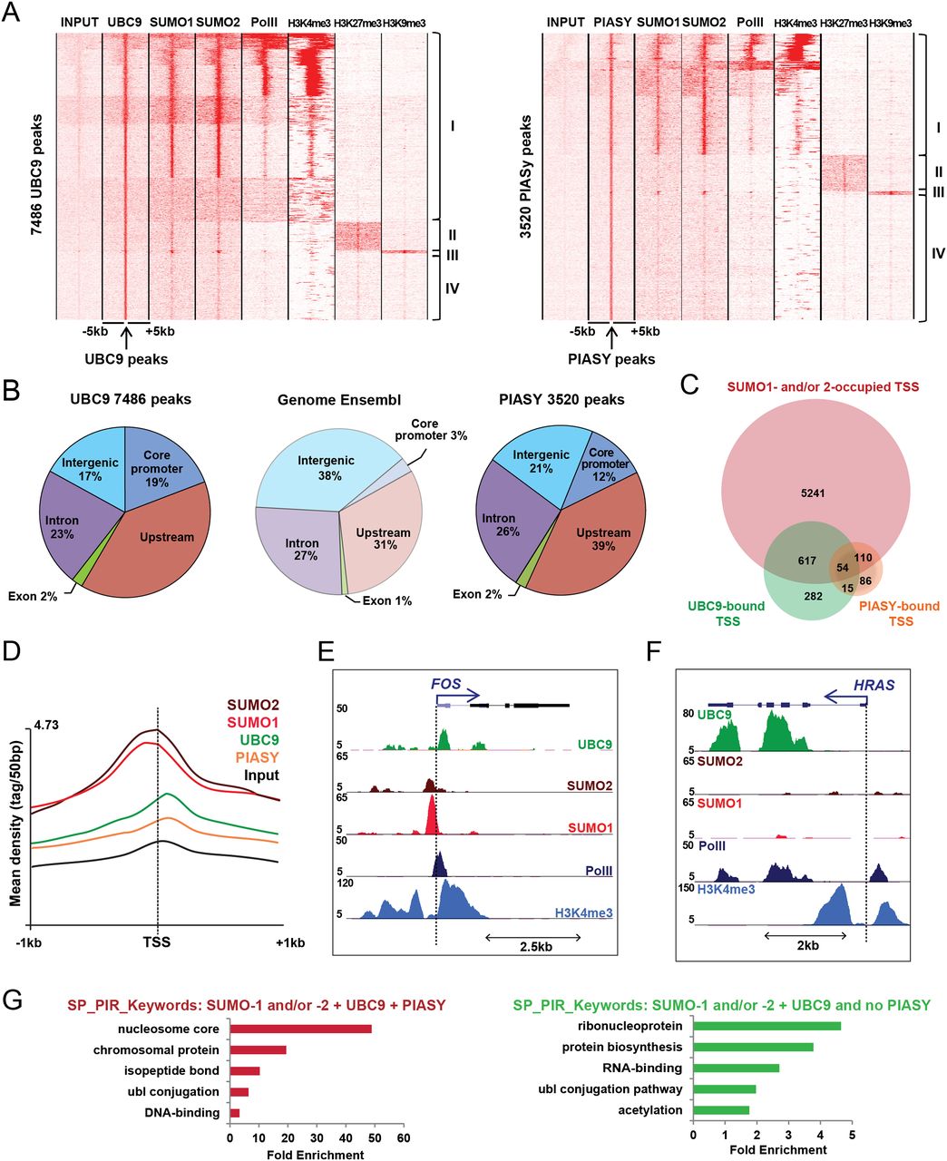 Chromatin profiles of UBC9 and PIASY. (A) Association of UBC9 (left) and PIASY (right) with SUMO1, SUMO2, Pol II, H3K4me3, H3K27me3, and H3K9me3 in WI38 proliferating cells. Comparison of the tag density in the ±5-kb region around UBC9- or PIASY-bound loci. Clustering identifies four classes as indicated. (B) Pie chart representation of UBC9 and PIASY binding site distribution in five different genomic regions as described in Fig. 1B. (C) Venn diagram representing overlap between SUMO1- and/or SUMO2-, UBC9- and PIASY-marked TSS. (D) Merged profiles of the SUMO machinery read density with respect to distance from TSS. (E,F) A Genome Browser view of the indicated ChIP-seq data at the FOS (E) and HRAS loci (F). (G) DAVID functional annotation of TSS marked by SUMO, UBC9, and PIASY (left) or SUMO, UBC9, but no PIASY (right). The top overrepresented categories are shown.