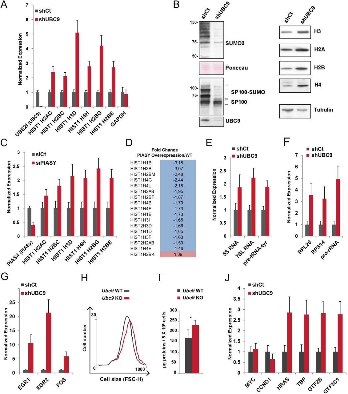 Sumoylation controls expression of histone and growth control genes. (A) WI38 cells were infected with lentiviruses expressing control shCt or shUBC9 shRNAs. Five days post-selection, the expression of the indicated genes was analyzed by RT-qPCR. (B) Western blot analysis of WI38 cells expressing shCt or shUBC9 showing expression of histones H3, H2A, H2B, and H4. Tubulin and Ponceau were used as loading controls. Depletion of UBC9 and concomitant loss of global sumoylation and sumoylated SP100 are shown as controls for knockdown efficiency. (C) WI38 cells were transfected with a control siCt or siPIASY siRNAs, and the expression of the indicated genes was analyzed by RT-qPCR. (D) Affymetrix analysis of histone mRNA differential expression in retrovirally infected WI38 cells overexpressing PIASY or a control vector (WT). (E–G) As in A. (H) Forward scatter analysis (FSC) of Ubc9+/+ (WT) and Ubc9fl/-;T2 (KO) MEFs treated for 7 d by tamoxifen (Demarque et al. 2011) (four embryos/genotype); mean size (FSC units): 628 ± 17.5 (Ubc9−/−) versus 594.3 ± 7.1 (Ubc9+/+); P-value = 0.006; one representative example is shown. (I) Total protein levels as measured by OD normalized to cell number of Ubc9+/+ (WT) and Ubc9fl/-;T2 (KO) MEFs treated for 7 d by tamoxifen (four embryos/genotype); mean amount (μg/mL): 219.3 ± 32.9 (Ubc9−/−) versus 193.5 ± 63.2 (Ubc9+/+); P-value = 0.019. (J) As in A. For all RT-qPCR, experiments were carried out in triplicate and data are represented as mean ±SEM (n = 3).
