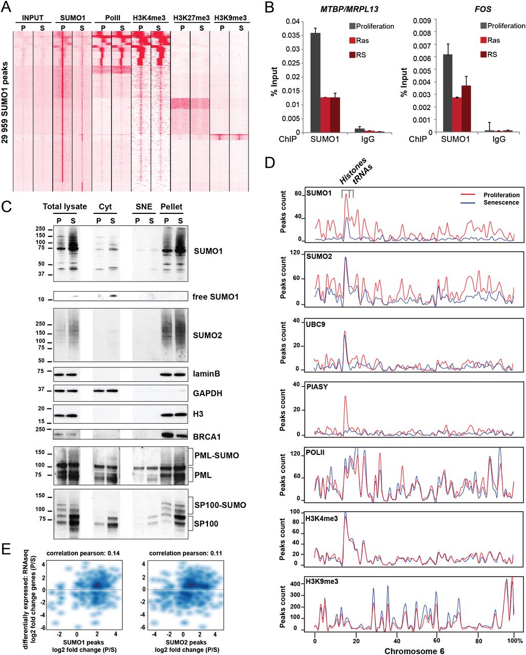 The SUMO machinery is released from chromatin in senescent cells. (A) Comparison of SUMO1 association with Pol II, H3K4me3, H3K27me3, and H3K9me3 in proliferating (P) and HRASG12V-induced senescent (S) WI38 cells. (B) ChIP-qPCR for SUMO1 in proliferating (P), HRASG12V-induced senescent (RAS), and replicative senescent (RS) WI38 cells on MTBP/MRPL13 and FOS promoters. (C) Proliferating and senescent cells were fractionated, and the presence of the indicated proteins in each fraction was quantitated by Western blot. Equal amounts of proteins were loaded for total lysate, Cyt (cytoplasmic fraction), SNE (soluble nuclear extract), and pellet (insoluble fraction). (D) Plots showing peak density in proliferating (red) and senescent (blue) cells over chromosome 6. (E) Scatter plot comparison of differential gene expression as measured by RNA-seq and differential occupancy of SUMO1 (left) or SUMO2 (right) (peak height fold change) in proliferating versus senescent cells. Differential expression is shown as log2 of reads per RPKM.