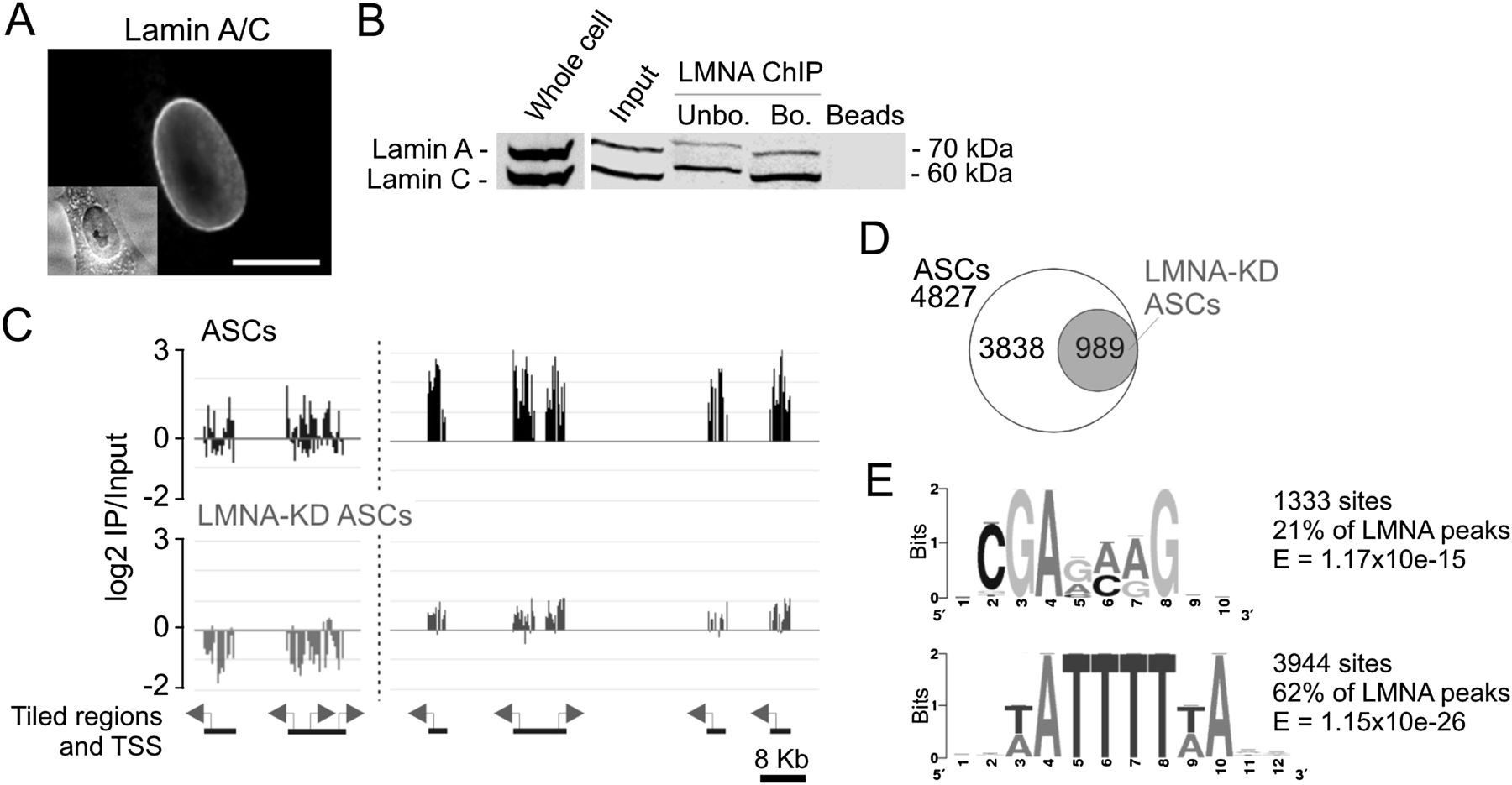 LMNA interacts with promoters in adipose stem cells. (A) Immunofluorescence detection of lamin A/C in ASCs. (Inset) Phase contrast. Bar, 10 μm. (B) Western blot analysis of lamin A/C in ASCs, ASC chromatin (input), and antibody-unbound and -bound fractions after LMNA ChIP. (C) Browser view of LMNA occupancy on two regions of chromosome 1; (left) nucleotide 1,230,000–1,260,000 (TNFRSF18, TNFRSF4, SDF4, B3GALT6); (right) nucleotide 12,810,000–12,888,000 (PRAMEF11, HNRNPCL1, PRAMEF2, PRAMEF4, PRAMEF12) in ASCs before and after LMNA KD. (D) Number of genes with a LMNA-associated promoter in ASCs and in LMNA-KD ASCs. (E) GAGA and A/T-rich motifs enriched in promoter regions underlying LMNA peaks.