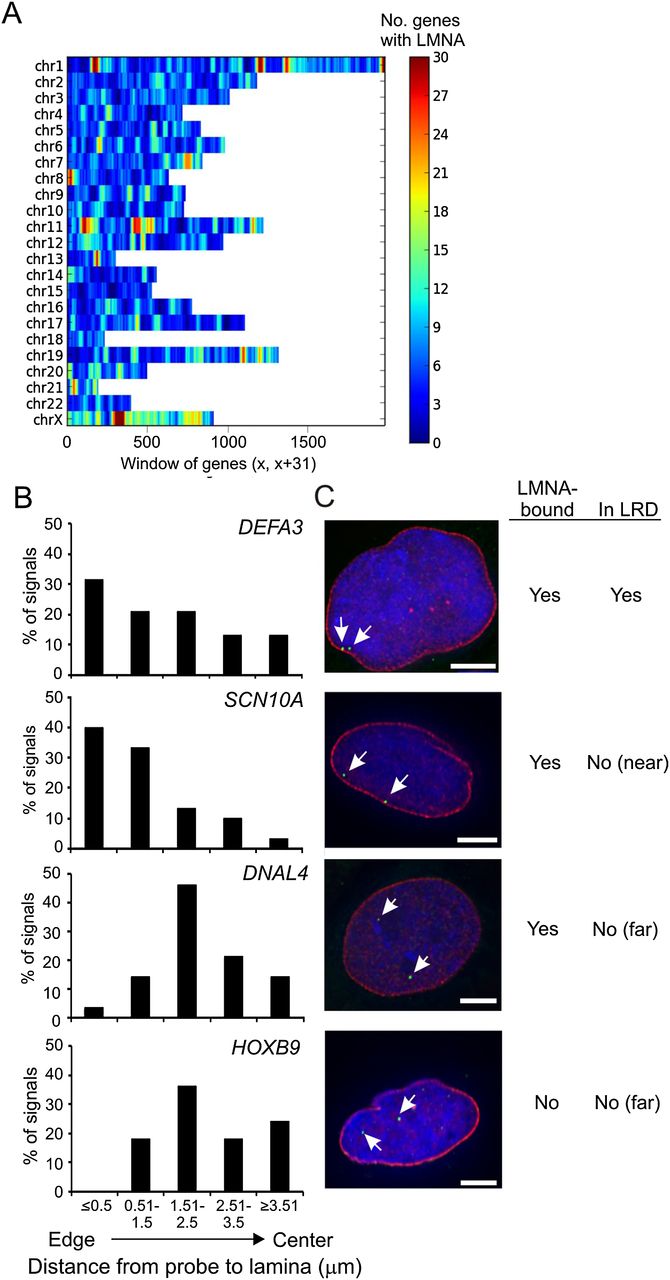 3D immuno-FISH unveils peripheral and intra-nuclear LMNA-associated loci. (A) LMNA enrichment in sliding 31-gene windows (x, x+31) across chromosomes. Scale shows the numbers of LMNA-enriched genes in the window. (B) Distribution of FISH signals from LMNA-enriched (DEFA3, SCN10A, DNAL4) and nonenriched (HOXB9) loci relative to peripheral LMNA (n ≥ 30 loci per gene). (C) 3D immuno-FISH (green; arrows) of loci shown in B relative to peripheral LMNA labeling (red). DNA is stained with DAPI. Scale bars, 5μm.
