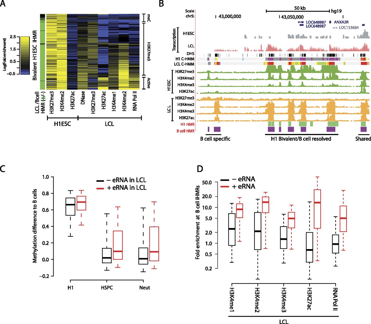 Resolution of bivalent iHMRs during differentiation and stepwise, de novo hypomethylation at transcribed enhancer-like iHMRs. (A) Bivalent iHMRs are resolved to active or silenced chromatin states during differentiation. Heatmap showing the LCL chromatin profile at iHMRs with a bivalent chromatin signature in H1 ESCs. Sidebar colors indicate whether the HMR remains hypomethylated in B cells (green) or becomes fully methylated (black). (B) Example locus surrounding ANXA2R, a gene expressed in lymphocytes and bone marrow, illustrating the coordinated resolution of the H1 ESC bivalent chromatin state in B cells/LCL. ENCODE regulation and transcription tracks are shown along with chromatin states modeled by ChromHMM (Ernst et al. 2011) in H1ES and GM12878 cells. Transcription tracks are presented in log scale. (C) Transcribed, active enhancer-like iHMRs in B cells are fully methylated in H1 ESCs and show intermediate states in other blood cell types. Differences in methylation levels between other cell types and B cell iHMRs are shown. (D) Only B cell iHMRs with eRNA (>0.1 RPKM) show strong enrichment for chromatin marks, suggesting an active regulatory state.