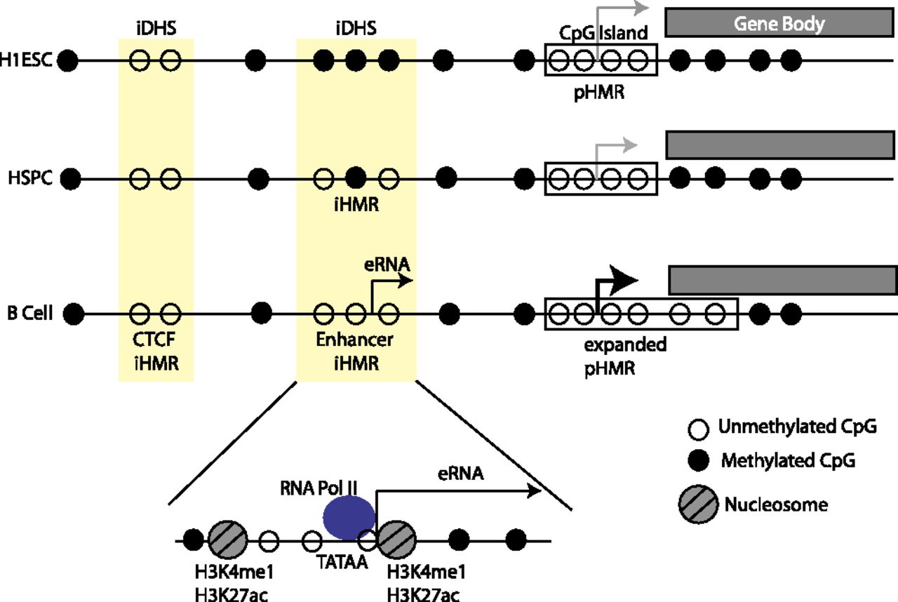 Model of iHMR behavior at a B cell specifically expressed gene. Shared DHS sites are pre-established in the embryonic stem cell. Hypomethylation at the CpG Island gene promoter (right) and at a CTCF iHMR (left) is constant during development. The enhancer-like iHMR (middle) is fully methylated in H1 ESC. In blood-specified progenitors (HSPCs), it becomes partially demethylated but remains inactive, i.e., lacks H3K4 methylation and RNA transcription. In the B cell state, where the gene is expressed, the promoter HMR expands beyond the core CGI region, and the iHMR becomes fully hypomethylated. The enhancer-like iHMR displays an active enhancer chromatin state (H3K4me1, H3K27ac). It is bound by TBP and RNA Pol II at specific sequence elements (including the TATA box), which initiate eRNA transcription within the iHMR.