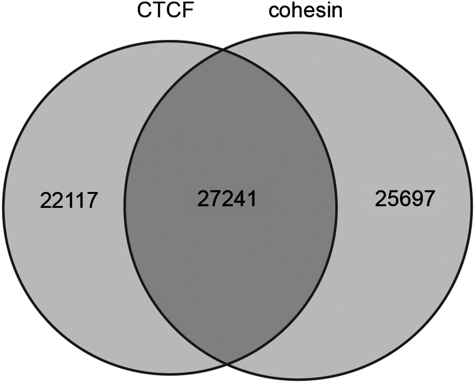 Overlap of the 49,358 CTCF and 52,938 cohesin binding regions in mouse brain. This demonstrates that just over half of CTCF (55%) and cohesin (51%) binding sites are shared, suggesting both independent and combinatorial functions for CTCF and cohesin in the 3-wk mouse brain.