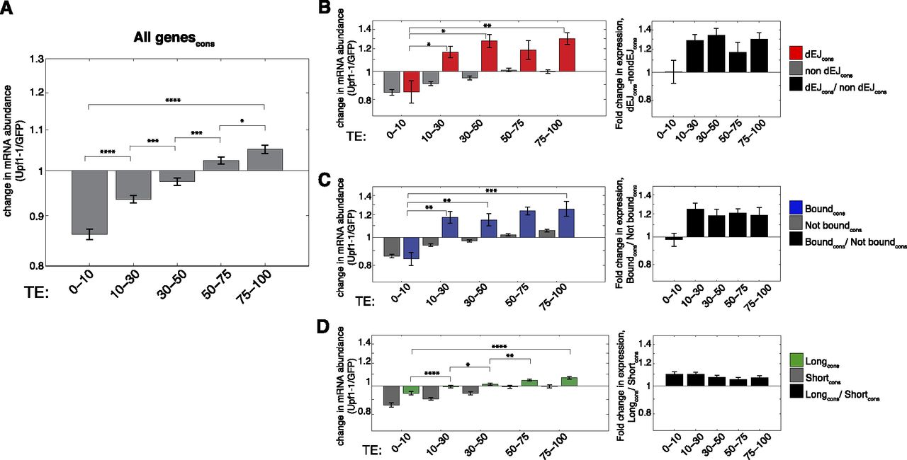 Relationship between TE and NMD-triggering gene features. (A) Median fold change of mRNA abundance following UPF1 depletion (shRNA Upf1-1) for consistently behaving genes grouped by percentile rank of translational efficiency (TE). Results were similar using shRNA Upf1-2 and CHX treatment (not shown). (B) As in A, except for non-dEJ (gray) and dEJ (red) mRNAs. Ratios of median fold change in expression following UPF1 depletion between dEJ and non-dEJ mRNAs with given TE is shown at right (black). For dEJ calculation, expression changes were calculated on an isoform level and TE was assigned based on the TE of the full ORF. (C,D) As in B, except for UPF1 binding in 3′ UTRs (C, blue) and 3′ UTR length (D, green). Long and short 3′ UTRs were defined as 1500–10,000 nt and 50–350 nt, respectively. Significance of differences in expression changes between TE bins of non-feature-containing genes (non-dEJ, not bound, and short 3′ UTR) were similar to those of all genes in A. All expression fold changes and ratios are plotted on a log2 scale. P-values calculated using Wilcoxon rank sum test. Asterisks as in Figure 1.