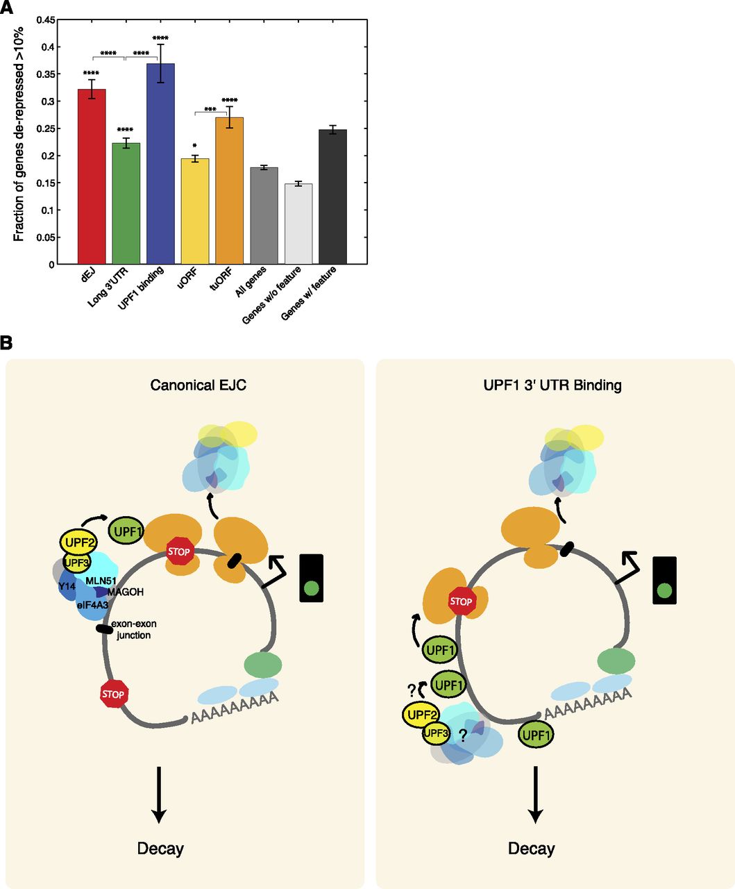 NMD features and models of UPF1-dependent mRNA repression. (A) Predictive capacity of mRNA features for NMD-regulation. Fractions of expressed genes harboring a dEJ (red), long 3′ UTR (green), UPF1 3′ UTR binding (blue), uORF (light orange), and/or tuORF (orange) that were derepressed consistently are shown. Shown for comparison are the fractions of genes derepressed consistently regardless of feature content (medium gray), without any NMD-inducing feature (light gray), and with at least one feature (dark gray). P-values above each feature indicate significance relative to all expressed genes; brackets indicate significant comparisons between features (hypergeometric test). See also Supplemental Figure S5A. Asterisks as in Figure 1. (B) (Left) Canonical dEJ-mediated regulation. EJC components (blue and gray) are deposited as a consequence of splicing in the nucleus ∼24 nt upstream of an exon-exon junction (black bar). Members of the EJC, including UPF2 and UPF3, help to stabilize the transient UPF1-ribosome interaction as well as to stimulate UPF1's phosphorylation and helicase activity, ultimately leading to decay of the message. (Right) 3′ UTR UPF1 binding-mediated regulation. UPF1 binds to mRNA 3′ UTRs independent of the presence of an exon-exon junction. At some frequency, UPF1 is activated by interaction with cytoplasmic EJC components. These factors may either be recently released from mRNAs due to translation or perhaps stably associated with message 3′ UTRs independent of an exon-exon junction.