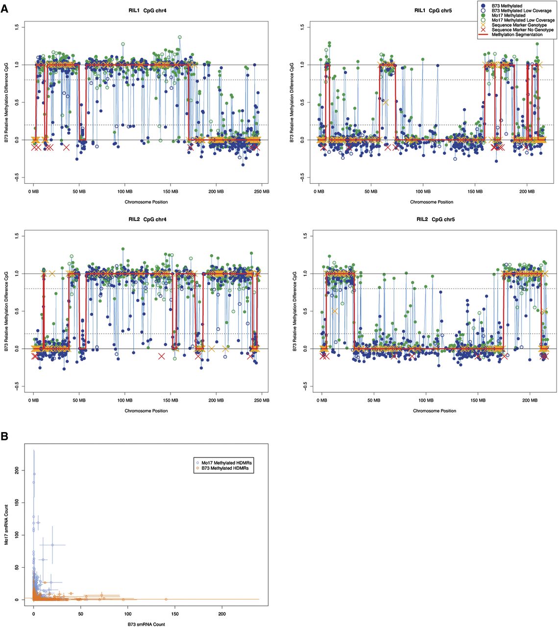 Inheritance and stability of DNA methylation patterns. (A) 9635 regions in the genome where B73 and Mo17 have different CG methylation levels were found using a moving window and a χ2 test based on C and T counts at CG sites. The regions were chosen so that one parent is <10% methylated and the other >70%. The regions are at least 200 bp long and have at least 20 CG sites. There is one point on the plots for each of these 9635 regions. The x-axis is the region number in chromosome order. The y-axis value is (%C in RIL − %C in B73)/(%C in Mo17 − %C in B73). Thus, data points approaching 1 are similar to Mo17, and those approaching 0 to B73 in methylation level. Mapped (orange) and unmapped (red) markers indicate recombination break points. (B) Scatterplots of small RNA levels that match HDMR in each inbred. Error bars represent variation in small RNA levels found in three biological replicates.