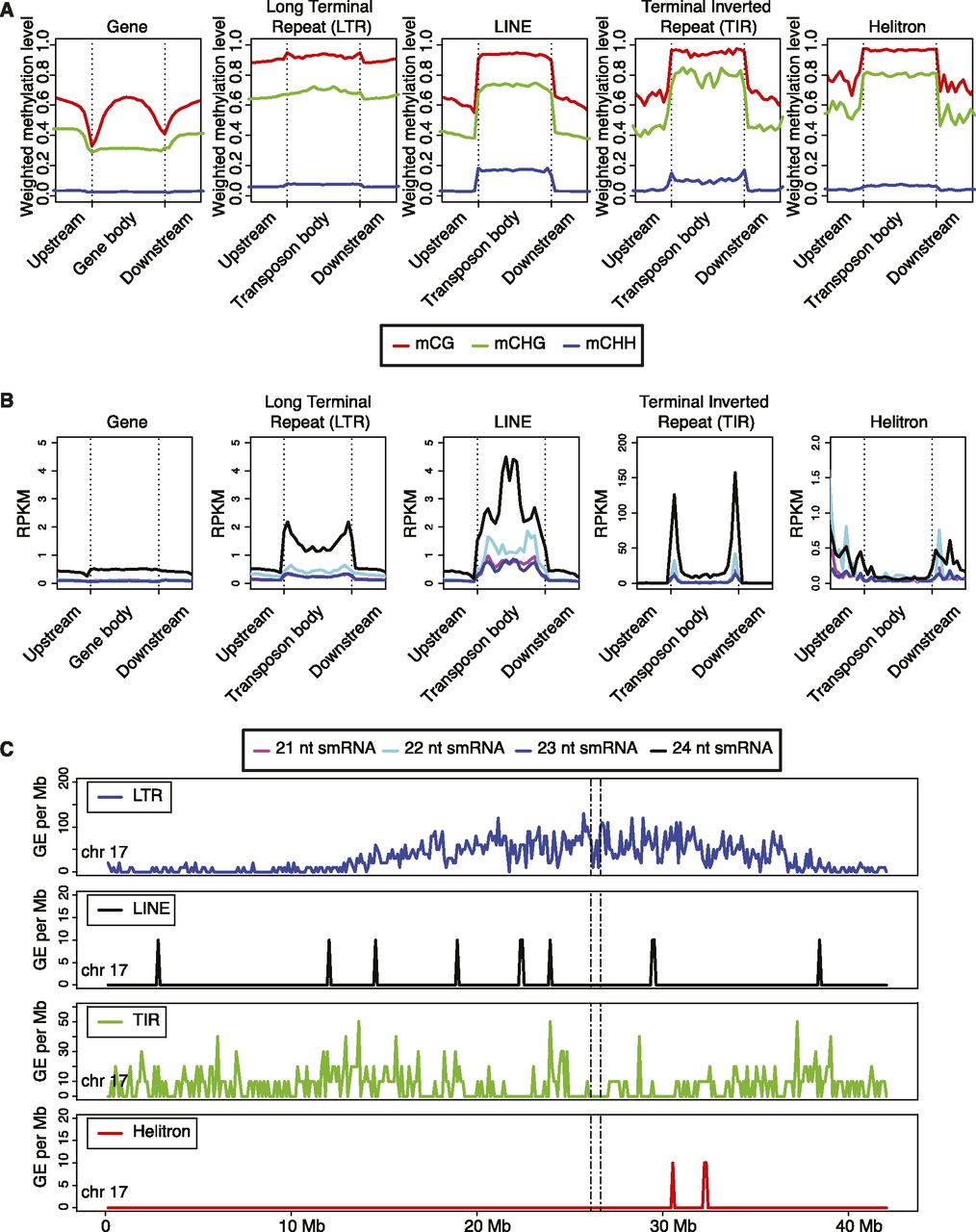 Characterization of gene body and transposon DNA methylation in soybean. (A) The distribution of mCG, mCHG, and mCHH densities and (B) the distribution of 21–24 nt smRNA levels in gene bodies, Long terminal repeats (LTRs) retrotransposons, LINE retrotransposons, terminal inverted repeat (TIR) DNA transposons, and Helitron DNA transposons including ±4 kb from the start and stop codons. (C) Chromosome-wide density of LTR, LINE, TIR, and Helitron transposons. Only data points between 1% and 99% quintiles were used to generate values for each bin in the plots presented in A and B.