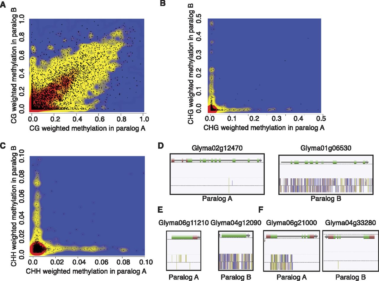 Pairwise methylation levels for paralog gene pairs. (A–C) Pairwise plots of CG (A), CHG (B), and CHH (C) methylation levels for all paralog pairs of genes. The A form of the paralog is plotted along the x-axis and the B form is plotted along the y-axis. (D–F) Examples of variation in RdDM-like methylation between paralog pairs in the LD methylome. (Gold lines) mCG; (purple lines) mCHG; (pink lines) mCHH. Loci containing >0.5% non-GC methylation levels were excluded from the plot in A, and genes containing >2.5% mCHG in B and C were considered targets of RdDM.