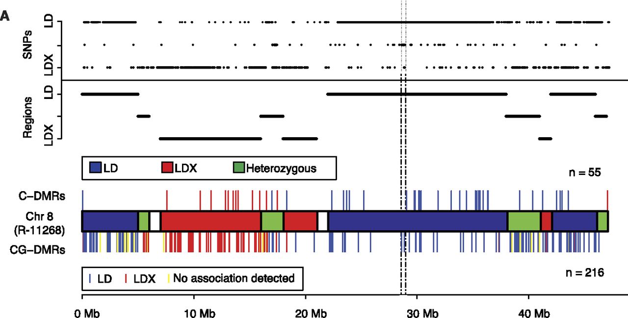 Heritability of CG- and C-DMRs in two soybean recombinant inbred lines. (A) Reconstitution of recombinant inbred line genotypes using SNPs between LD and LDX from bisulfite sequencing data. SNPs were combined to determine homozygous LD or LDX and heterozygous regions of each chromosome in R-11268 and R-11272. An example is shown for the patterns of heritability for both CG-DMRs and C-DMRs from chromosome 8 from R-11268. The entire data set can be found in Supplemental Tables 5 and 6. (Blue shaded areas) LD homozygous regions; (red shaded areas) LDX homozygous regions; (green shaded regions) heterozygous regions; (white shaded regions) ambiguous. (Blue bars) LD; (red bars) LDX; (yellow bars) no association detected.