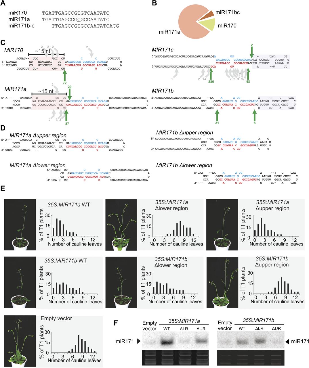 Mixed processing of MIR170/171 family members. (A) Sequences of miR170/171 miRNAs. (B) Relative abundance of the small RNAs by deep-sequencing small RNAs from wild-type plants. (C) Scheme showing the secondary structure and cleavage sites detected in the family members. Structured regions in the lower stem (MIR170, MIR171a) and upper stem (MIR171b/c) are highlighted with pink and gray boxes, respectively. The most abundant cleavage sites detected, which also release the miRNA/miRNA*, are indicated by green arrows. Gray arrows show other cleavage sites that are less abundant. The miRNAs are indicated in red and the miRNAs* in blue. (D) Scheme of MIR171a/b mutant precursors. (E) Phenotypes of transgenic Arabidopsis plants transformed with wild-type and mutant MIR171a/b precursors under the control of the 35S promoter. A representative transgenic plant overexpressing each construct is shown on the left. The panels show the cauline leaves' number distribution observed in at least 50 independent transgenic plants overexpressing each construct. (F) Small RNA blots showing the accumulation of miR171 in transgenic Arabidopsis seedlings expressing the different mutant precursors. (UR) Upper region; (LR) lower region. Each sample is a pool of at least 20 independent transgenic plants.