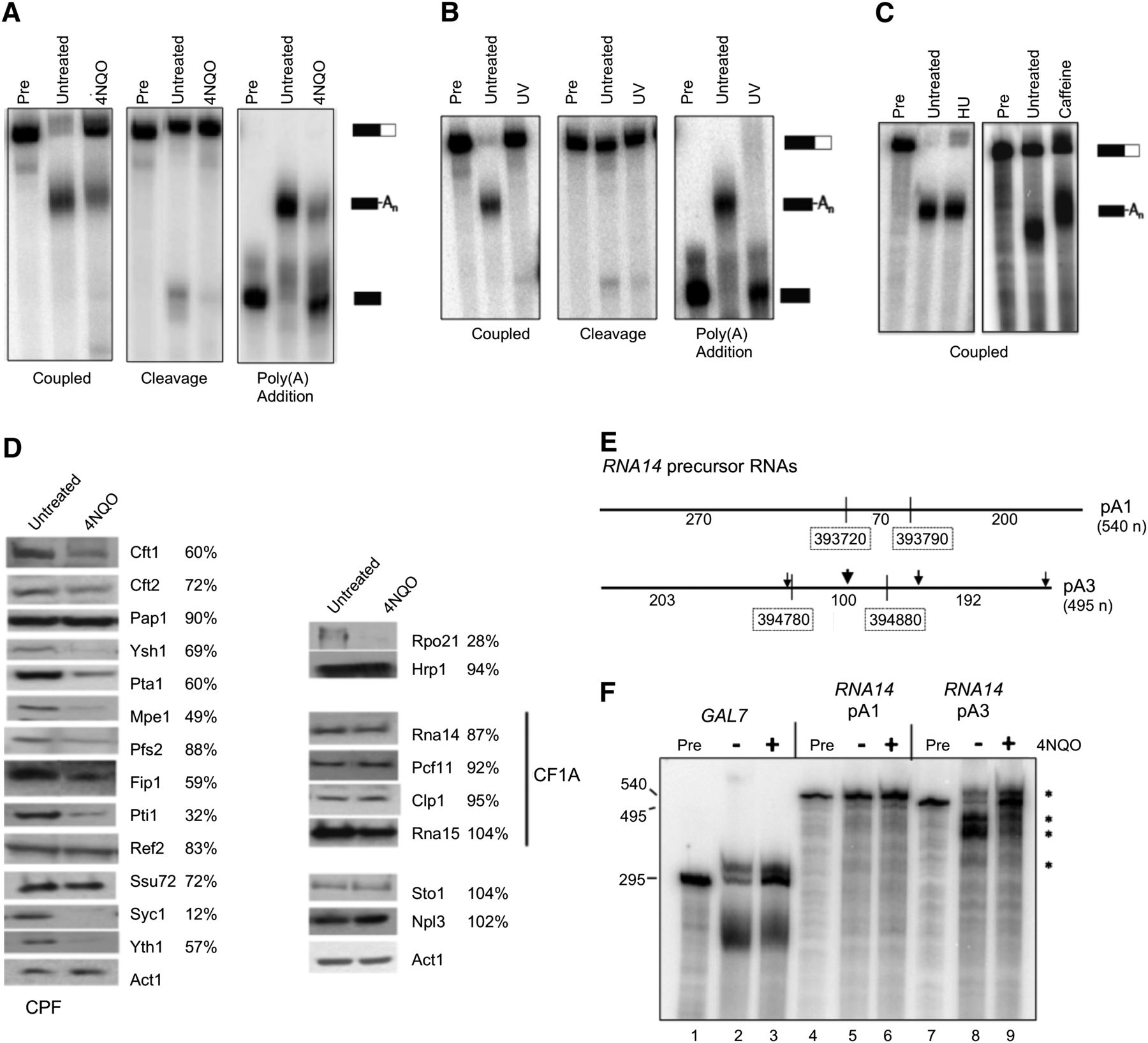 Effects of 4NQO on mRNA 3′-end processing. (A) In vitro processing efficiency. Yeast samples were treated with 5 μg/mL 4NQO for 2 h, followed by preparation of processing extracts. Coupled cleavage and poly(A) addition was assayed using radioactive precursor containing the GAL7 poly(A) site and flanking sequences (left panel). Cleavage was assayed by replacing ATP with dATP, which blocks tail extension (right panel, first three lanes). Poly(A) addition alone was assayed using RNA substrate ending at the GAL7 poly(A) (right panel, last three lanes). Unprocessed precursor is shown in the lanes marked “Pre,” and positions of substrate and product are shown on the right. (B) Effects of UV light on processing. Extracts were made from cells with or without exposure to UV light and examined for processing as described in A. (C) Effects of other agents on processing. Extracts were made from cells treated with hydroxyurea (HU, 10 mg/mL) or caffeine (20 mM) for 2 h, and coupled cleavage and poly(A) addition reactions compared with that of extract from untreated cells. Neither treatment inhibits the efficiency of processing, but we note that poly(A) tails are longer with exposure to caffeine. (D) Protein level variation. Western blots of Rpo21, processing complex subunits, Npl3, and Sto1, with actin (Act1) as the loading control. The percentage of protein remaining after 4NQO treatment was calculated after normalizing to Act1 and is indicated next to each protein. (E) Diagram of RNA14 substrates. This figure depicts the RNA14 precursors and indicates the position of poly(A) sites used in vitro in relationship to the region mapped for the upstream and downstream sites by DRS and shows the length of sequence in each portion of the transcript. The numbers marking the regions mapped by DRS correspond to the chromosomal positions shown in the CPD plot of Figure 2A. The product indicated for pA1 refers to the reactions in F. (F) Coupled cleavage and poly(A) addition reactions using the transcripts containing the first (pA1) or third (pA3) RNA14 poly(A) sites. Reactions were performed with GAL7 substrate (lanes 1–3), RNA14 pA1 (lanes 4–6), and RNA14 pA3 (lanes 7–9) using extract from cells with (+) or without (−) 4NQO treatment. Unprocessed precursor is shown in the lanes marked “Pre.” The products from the RNA14 pA3 substrate are indicated by an asterisk.