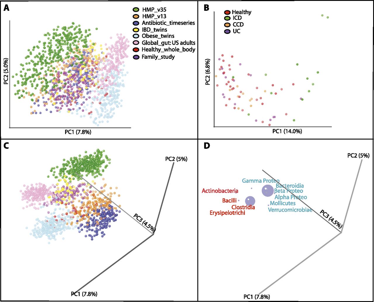 Unweighted UniFrac PCoA plots illustrating a strong study effect when comparing fecal samples of Western adults. (A) Studies conducted with Western adult populations. (B) Clustering of the fecal samples from IBD_twins (Table 1) colored by disease state. (ICD) Ileal Crohn's disease, (CCD) Colonic Crohn's Disease, (UC) Ulcerative Colitis. (C,D) Same as in A but with the axes rotated to maximize clustering by study. D shows just the bacterial orders as a weighted average of the coordinates of all samples, where the weights are the relative abundances of the taxon in the samples. The size of the sphere representing a taxon is proportional to the mean relative abundance of the taxon across all samples. Gram-positive bacterial orders are labeled in red text and Gram-negative in blue.