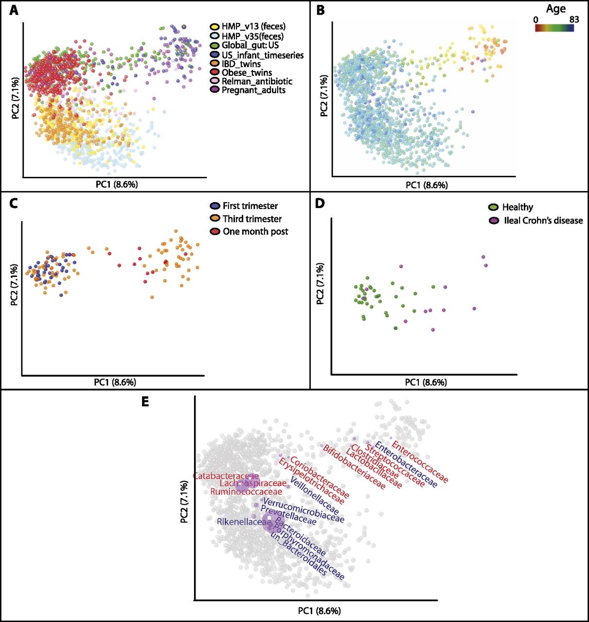 Unweighted UniFrac PCoA plots illustrating the relationship between the bacterial diversity in fecal samples from different disease/physiologic states in adults and the infant microbiome. (A) Compares samples from same studies as in Figure 3A, but with the US_infant_timeseries, the US infants and children from Global_gut, and adults from a study of pregnancy (Pregnant_adults) (Table 1) added in addition. (A–D) The same plot, except that different subsets of the samples are shown or are colored differently. (A) Points colored by study. (B) Points colored by an age gradient. The samples from Pregnant_adults are not shown because the age of study participants was not available. (C) Samples from pregnant women in their first and third trimesters and 1 mo post-delivery (from Pregnant_adults) (Table 1) (D) Healthy individuals and individuals with ileal Crohn's disease from IBD_twins. (E) Bacterial families are plotted as a weighted average of the coordinates of all samples where the weights are the relative abundances of the taxon in the samples (purple circles). Gram-negative bacterial orders are in blue text, Gram-positive in red.