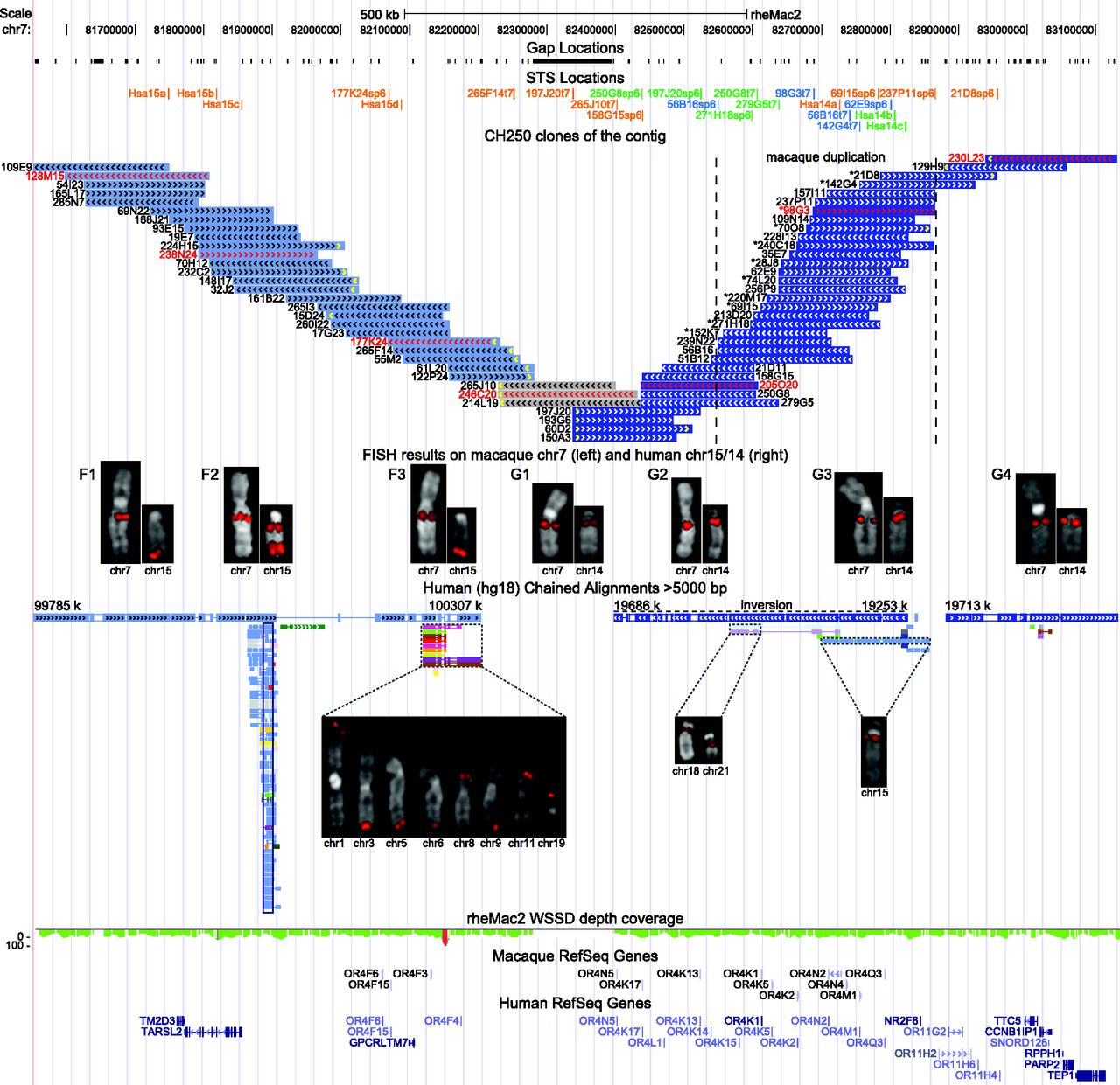 Contig of CH250 BAC clones on MMU7. The schematic shows features of the macaque genomic region spanned by the contig (chr7:81552000–83132000, rheMac2). In particular, gap and STS locations, BAC clones, FISH mapping data, chained alignments with hg18 reference, WSSD (whole-genome shotgun sequence detection) depth-of-coverage data (the green color corresponds to single copy; the red color to duplication; Marques-Bonet et al. 2009), macaque RefSeq genes, and human RefSeq genes in the orthologous human regions are shown. STS names are color-coded: STS used in radioactive hybridization (orange), STS used in PCR amplification (blue), and STS used in both assays (green). FISH results on MMU7 and human chromosomes 14/15 are shown for representative BAC clones marked by names and arrowheads in red. Seven different FISH patterns are identified: BAC clones of Groups F1–F3 map to the homologous region on chromosome 15 (light blue); BAC clones of Groups G2–G4 map to the homologous region on chromosome 14 (dark blue); and gray-colored BAC clones (Group G1) showed absent or weak signal on human chromosome 14 and correspond to the fission breakpoint. An asterisk in front of the BAC name indicates BAC clones belonging to the second copy of the macaque duplication. A yellow arrowhead marks BES not anchored to the human reference hg18. Additional FISH signals on other human chromosomes due to the presence of interchromosomal SDs (further indicated by the chained alignments) are shown for the BAC clones of Groups F3, G2, and G3. An empty black box marks the human GOLGA2–ITSN2 core duplicon. Both end segments of the contig (Groups F1 and G4) are in single copy and direct orientation in macaque and human.