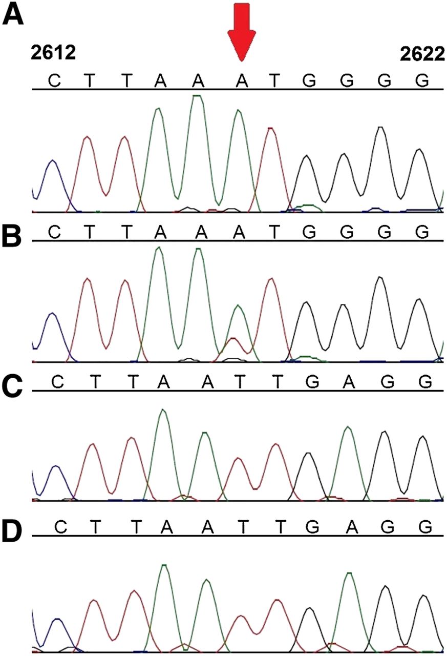 Sanger sequence analysis of position 2617 from DNA and RNA samples of mtDNA from various primates. Pongo pigmaeus (A) DNA and (B) RNA; Nycticebus coucang (C) DNA and (D) RNA. Red arrow indicates nucleotide position corresponding to position 2617 in human mtDNA. Numbers on top of each base indicate positions according to the rCRS.