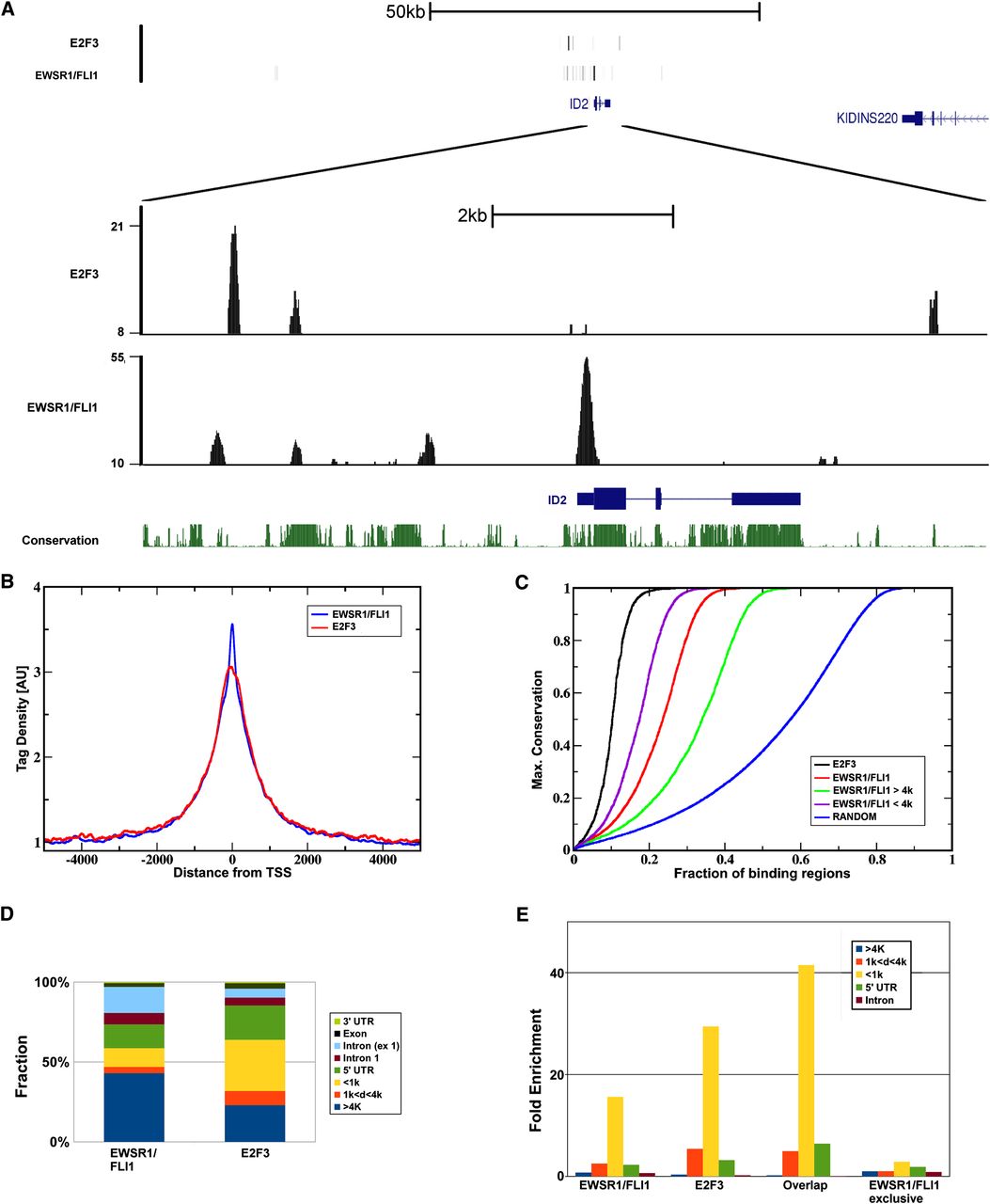 Characterization of DNA binding regions. (A) ChIP-seq tag density plot for EWSR1/FLI1 and E2F3: Regions of significantly increased tag densities typically occur as clusters in relatively small, focal regions, with little or no signal between clusters. In an ∼130-kb genomic region (upper plot), increased densities are almost exclusively observed in the immediate vicinity (lower plot) of ID2, a known regulatory target of ETS factors. Both E2F3 as well as EWSR1/FLI1 demonstrate partially overlapping regions of increased tag densities. (B) Increased binding close to transcription start sites: relative number of reads covering regions centered at transcription start sites. Shown is the tag density averaged over all RefSeq annotated transcription start sites normalized to one at a large distance for EWSR1/FLI1 and E2F3 chromatin immunoprecipitations. (C) High conservation of binding regions: fraction of binding regions (abscissa) with a maximal conservation smaller or equal to the value on the ordinate. More than 90% of the E2F3 binding regions had a maximum conservation score >0.5, and in 75% conservation reached the maximum value of one. EWSR1/FLI1 binding regions, too, show a high degree of conservation, regardless of whether they are located within proximal promoter regions or in distal regions. As a reference, the random curve estimates the behavior of unselected regions in the genome. (D,E) Gene compartments. (D) Distribution of binding events with respect to RefSeq gene annotations: In comparison to E2F3, a significantly larger proportion of EWSR1/FLI1 binding occurs in intergenic (>4k from closest gene) and intronic regions. (E) Enrichment of binding events in gene compartments estimated by comparison to randomized binding demonstrates a very strong promoter bias for E2F3 binding, and to a somewhat lesser extent, EWSR1/FLI1. The latter is in part explained by colocalization of both factors. EWSR1/FLI1 binding regions not overlapping with E2F3 demonstrate only weak promoter bias.