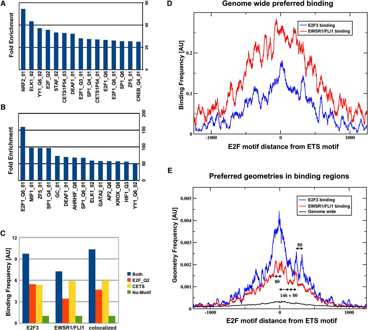 In silico analysis of binding regions. (A,B) Overrepresented transcription factor recognition sequences within binding regions of EWSR1/FLI1 and E2F3, respectively. The set of motifs shown in B has been selected in order to reduce redundancies between similar motifs. A complete list can be found in the Supplemental Material (Supplemental Table S3). (C) Binding frequency is correlated with the presence of ETS and E2F binding motifs in the promoter DNA sequence: Shown is the frequency of binding events of E2F3, EWSR1/FLI1, or both factors simultaneously (i.e., the average number of binding events per promoter). In this analysis promoters were subdivided into four groups, containing either E2F or ETS, neither, or both motifs. The group containing none of the two motifs was used for normalization, setting the frequency to one. Expanding the analysis to include the relative organization of ETS and E2F motifs in regions containing both motifs, it becomes apparent (D) that the effective binding affinity depends on that organization. The number of experimentally observed binding events (y-axis) overlapping any given ETS motif in the genome depends on the oriented distance (x-axis) from that ETS motif to the next E2F motif. (E) Specific spatial arrangements of ETS and E2F recognition sites are overrepresented in E2F3 and EWSR1/FLI binding regions. The plot displays the frequency of spatial configurations of ETS and E2F motifs within ChIP-seq binding regions of EWSR1/FLI1 and E2F3. Besides a global maximum at close distances, as expected in promoter regions with an overall increase of recognition sequences, discrete regions of increased frequency of pairs of E2F and ETS factors are visible. As a reference, scales for lengths 80 bp (length of one internucleosomal linker) and 146 bp (length of nucleosomal DNA) are also displayed in the graph. The frequency measurements depicted in D and E can best be interpreted as conditional probabilities, where D shows the probability to observe binding given that there is a specific geometric organization of the binding sites, while E shows the probability of finding a specific geometry, given that there is a binding event. Even though these two observations are related by Bayes' theorem, they are mutually independent, as discussed in detail in the Supplemental Material.