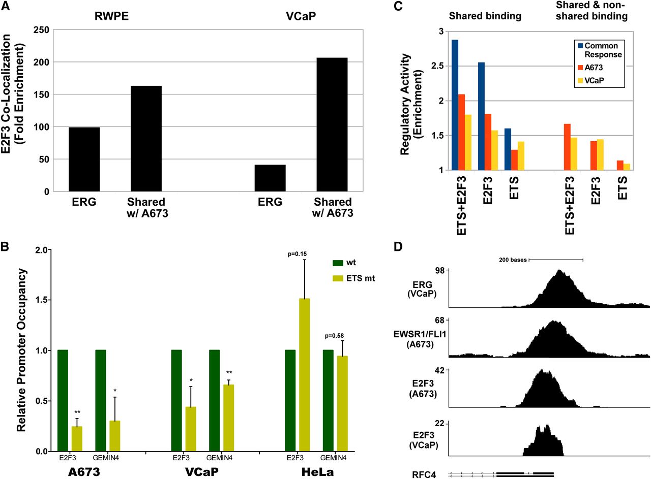 Comparison of ETS factor binding and transcriptional regulation in prostate and ES cells. (A) ERG binding in RWPE and VCaP prostate cells occurs preferentially in regions bound by E2F3 in A673. Shown is the enrichment of ERG or TMPRSS2/ERG binding events in proximity to E2F3 binding regions calculated by comparison to a flat, random background model. Enrichment is even stronger for the component of ERG binding that overlaps that of EWSR1/FLI-1 in A673. (B) The occupancy by E2F3 in the promoter of E2F3 and GEMIN4 is significantly reduced in the models for ES (A673) and prostate cancer (VCaP) for promoters with a mutated ETS recognition site in comparison to wild-type sequence. In HeLa cells, mutation of the ETS recognition site does not significantly change E2F3 binding. (C) Enrichment of ETS fusion and E2F3 binding in proximity to genes positively regulated by the fusions in their respective cells (right half) and for binding events shared across A673 and VCaP cells (left). Shown is the enrichment of such genes positively regulated by ETS in VCaP (yellow), A673 (orange), or in the set of genes responsive in both cell types (blue). (D) Read densities in the promoter region of a representative ETS responsive cell cycle gene RFC4 illustrating similarity of overlapping binding by TMPRSS2/ERG and EWSR1/FLI1 with E2F3 in VCaP and A673 cells. See Supplemental Figure S5 for transcription factor motif analysis.