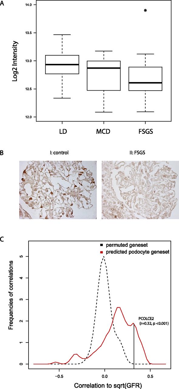 Regulation of predicted podocyte-specific gene set in human disease. (A) Box-and-whisker plot of glomerular mRNA expression of PCOLCE2 in biopsies from living donor controls (LD, n = 35), minimal change disease (MCD) patients (n = 12), and focal segmental glomerulosclerosis (FSGS) patients (n = 19). Asterisk denotes a significant differential expression (p < 0.05). (B) IHC staining of PCOLCE2 on kidney biopsies from controls (I) and FSGS patients (II). In comparison with control kidneys, PCOLCE2 signal disappears in FSGS patients. Images shown are the representative images in the glomerulus of controls (n = 5) and FSGS patients (n = 8). (C) Density plot of the association (Pearson correlation, x-axis) of the 136 predicted podocyte-specific genes (red) with renal function as quantified by GFR value, compared with density plot of repeatedly (100 times) randomized gene expression–GFR associations (black). The randomized set shows a distribution centered on zero (meaning no correlation with GFR), whereas the podocyte-specific genes show a skewed distribution toward positive correlation, indicating reduced gene expression is associated with impaired renal function. Correlation with GFR of the 136 transcripts across all renal diseases analyzed was significantly enriched compared with the permuted sample (p < 0.01). Black line indicates the correlation of PCOLCE2 mRNA level with GFR.