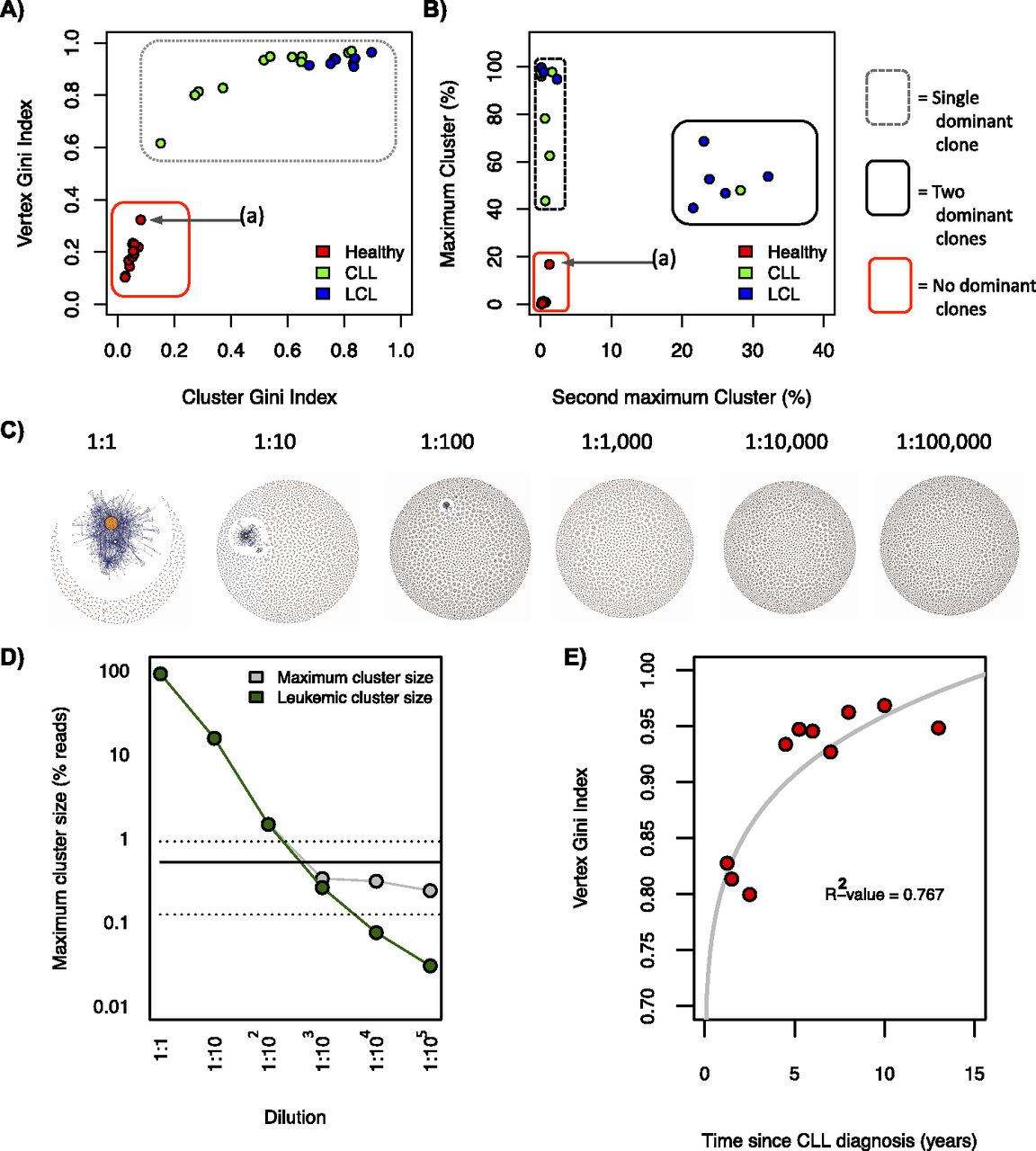 Measures differentiating between B-cell receptor populations. (A) Cluster Gini Index plotted against vertex Gini Index for 13 healthy individual samples, 11 chronic lymphocytic leukemia (CLL), and eight human lymphoblastoid cell line (LCL) samples. Point (a) corresponds with healthy individual 10. The red box and gray dashed box distinguish between the regions occupied between diverse and clonal populations, respectively. (B) The second maximum cluster sizes plotted against the maximum cluster sizes. The red, gray-dashed, and black solid boxes distinguish between the regions occupied between unexpanded populations, monoclonal expanded populations, and biclonally expanded populations, respectively. (C) B-cell receptor networks for the titration of a chronic lymphocytic leukemia clonal sample into healthy peripheral blood from the data set from Boyd et al. (2009), and (D) the corresponding number of reads corresponding to the leukemic clone (green) and the maximum cluster size of each dilution (gray). The solid horizontal line shows the mean maximum cluster size for healthy individuals from this data set (0.52% of total reads), and the dashed horizontal lines show the mean ±SD of maximum cluster size for healthy individuals for this data set. (E) Correlation between the Gini Index and the length of time since chronic lymphocytic leukemia (CLL) diagnosis for each patient in our data set, with corresponding R2-value.