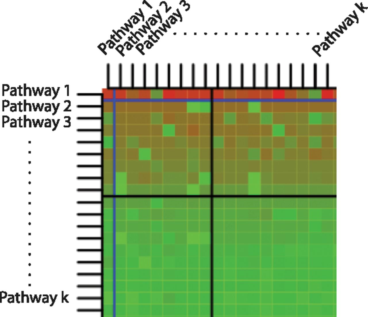 Example of a crosstalk matrix. On the diagonal, we find the classical overrepresentation analysis, ordered by P-value. The blue line represents the 0.01 significance level, while the black line represents the 0.05 significance level. The P-values in the matrix have been log-transformed (base 10 log), and the sign of the result has been inverted. The color of the cell represents the P-value: bright red for P-values close to zero, bright green for P-values close to 1.