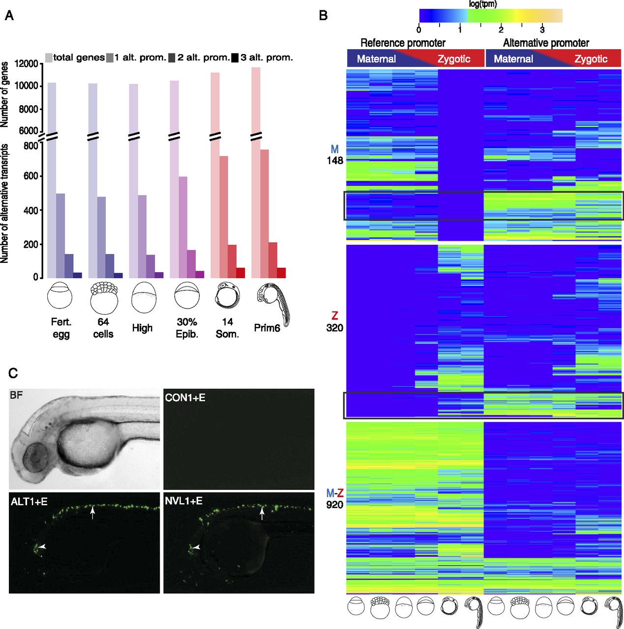 Identification and developmental dynamics of alternative initiation sites. (A) Frequency and developmental dynamics of alternative promoters. Colors reflect maternal to zygotic transition as in Figure 1. Genes with up to three alternative promoters are plotted (see Supplemental Table 7 for details). Shades indicate alternative promoter numbers, color transition indicates maternal to zygotic transition of transcriptome. (B) Clustering of three sets of genes based on their reference promoter activity. Annotated reference promoters (as assigned by Ensembl 71) are on the left and alternative promoters on the right. Genes are clustered in three groups according to the reference promoter being active during maternal (M), zygotic (Z), or maternal and zygotic (M-Z) stages. Total number of genes in each group is indicated in the left. Black rectangles indicate genes where the previously unannotated alternative promoter's activity is preferential over that of the annotated reference promoter. (C) Fluorescent Venus reporter activity driven by alternative (ALT1) and novel (NVL1) core promoters attached to a neural specific enhancer (E) in transgenic embryos. Control (CON) indicates a random DNA fragment replacing a promoter. Maximum projections of embryos overlaid from a single injection experiment are shown (see details in Supplemental Table 8). Bright-field (BF) image of a single zebrafish embryo is shown for reference. (Arrowhead) Cerebellum; (arrow) spinal cord activity.