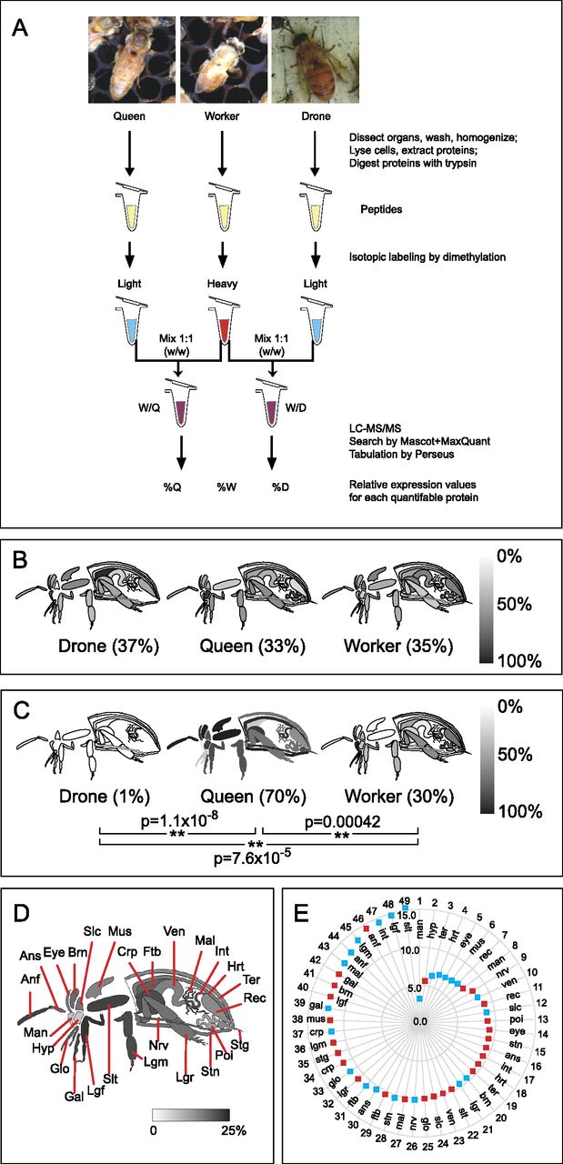An overview of the Honey Bee Protein Atlas. (A) Sample handling flowchart. Worker proteins from each organ served as a reference against which queen and drone organs were compared. The relative abundance of actin (B) and vitellogenin (C) in the organs of each caste are shown on a grayscale. The absence of an organ indicates that either the organ does not exist (e.g., stinger in drones) or the protein was not detected there. Whole-body averages are shown in parentheses; (**) P < 0.01. (D) A diagrammatic representation of each tissue, and the percentage of quantified proteins in queens and/or drones whose expression level is significantly different from the worker at P < 0.05. Individual percentage differences in queen–worker (red squares) and drone–worker (blue squares) comparisons for the tissues are shown as a radar graph (0% at the origin up to 15%) in E, arranged from the least different (wheel position 1) to most different (wheel position 49) tissue. (anf) flagellum (antenna); (ans) scape (antenna); (brn) brain; (crp) crop (forgut); (ftb) fat body; (gal) galea (mouthpart); (glo) glossa (mouthpart); (hrt) heart; (hyp) hypopharngeal gland (queen and worker only); (int) intestine; (lgf) front leg; (lgm) middle leg; (lgr) rear leg; (mal) Malpighian tubules; (man) mandibular gland; (mus) thorax muscle; (nrv) nerve; (poi) poison sac (queen and worker only); (rec) rectum; (slc) post-cerebral salivary gland; (slt) thoracic salivary gland; (stg) sting (queen and worker only); (stn) sternite; (ter) tergite; (ven) ventriculus (midgut).