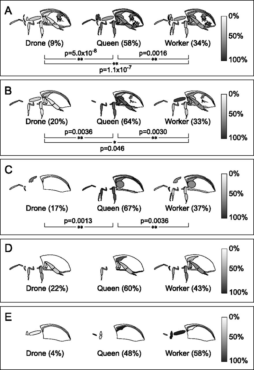 Caste and organ distribution of immunity proteins. (A) PPO, (B) PGRP-S3, and (C) GNBP 1-2 expression is significantly higher in queens compared with the other castes. Overall expression levels of the antimicrobial peptides hymenoptaecin (D) and defensin (E) are not different (P > 0.1), except that drones express far less defensin than queens or workers. Relative levels across each organ shown on a grayscale. Whole-body averages are shown in parentheses; (*) P < 0.05, (**) P < 0.01.