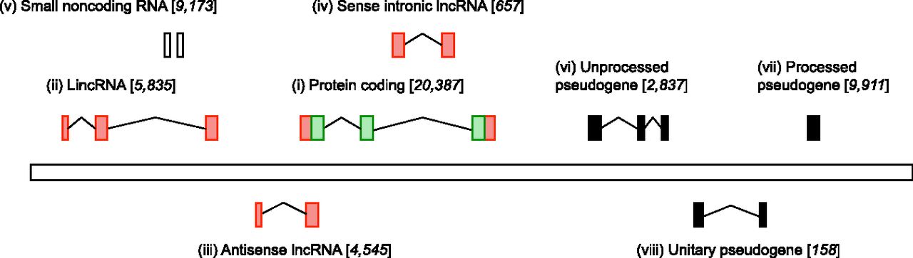 A summary of locus biotypes in GENCODE. This schematic details the major classes of loci found in the GENCODE v16 human gene set, and in square brackets the total number of each set. These counts are made at the locus level as opposed to the transcript level. GENCODE contains 194,034 transcripts in total, 81,626 of which have an annotated CDS. This means there is an average of 4.0 CDS transcripts per protein-coding gene, while 14,786 protein-coding genes contain more than one distinct CDS (i). Long intergenic RNAs (lincRNAs), antisense RNAs, and sense intronic RNAs are treated as sub-biotypes of lncRNA (ii–iv). In GENCODE, lincRNAs are models that do not overlap a protein-coding gene or pseudogene on either strand, antisense RNAs are models found on the opposite strand to exons or introns of protein-coding genes, and sense intronic RNAs are found entirely with the intron of a protein-coding gene. In total, GENCODE contains 22,444 lncRNA transcripts, an average of 1.7 per lncRNA locus. (v) The 9173 loci classed as small noncoding RNA loci include the classic rRNA and tRNA genes, as well as the more recently identified categories of loci such as miRNAs, snoRNAs, and piRNAs. The 13,419 pseudogenes found in GENCODE can be divided into three major classes: unprocessed, processed, and unitary (vi–viii). Unprocessed pseudogenes result from the genomic duplication of protein-coding genes; pseudogenization may come from the fact that the duplication is partial, or by subsequent mutation. Processed pseudogenes are formed by the retroinsertion of mRNAs into the genome sequence, and these loci are thus typically intronless. Unitary pseudogenes are protein-coding genes that are pseudogenized in the human lineage, as judged by a comparison with an intact coding ortholog in another species. Further to this diagram, GENCODE also contains 26 polymorphic pseudogenes: models in the reference assembly that are known to exist as intact protein-coding loci in other human genomes. All classes of pseudogenes may be subjected to transcription.